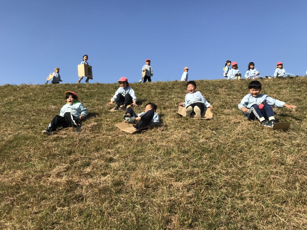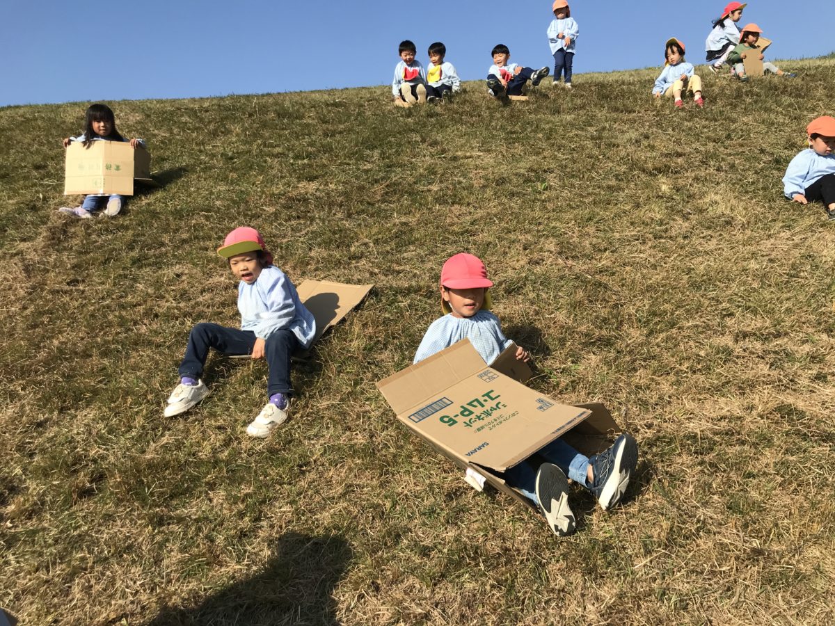 今日は土手の方へお散歩に行きました。「なんで、だんぼーるもっていくのー?」「これですべったことある!」「じゃあ、すべるんじゃないー?」とウキウキしながら歩いていた子ども達。土手の方へ行くと「ここですべりたい!」と大盛り上がり!遊ぶ前に『反対のぼりしない!』『頭から滑らない!』とお約束を作り、いざスタートしました。土手滑りが初めてのお友だちは「どうやってするんだろう?」と滑ったことのあるお友だちの姿を見ながら、段ボールを下に敷き滑ろうとしましたが段ボールが先に滑っていってしまい・・・「どうしたらできるんやろ?」と考えていると「これやったら、だいじょうぶやで!」と段ボールの間に入り滑っている子の姿が!それを見た周りのお友だちも「すべれたー!」ととても楽しそうに滑る姿がありました。帰り道では、りんご組さんが一人でいると「いっしょにいく?」とさくらんぼ組のお友だちが声をかけてあげる姿があり、自分たちがしてもらったことを年下のお友だちにしてあげる頼もしい姿が増えてきました。