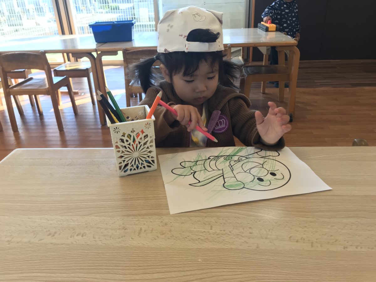 登園してすぐ水槽にいる魚に興味を示し、「いっぱいいるね!」「大きいね!」と話しながらじっくり見ていました。草の中に隠れていた魚を見つけると、「こんな所にもいる!」と嬉しそうでした。キャラクターのぬりえを置いておくと「僕これする!」と色々な色のペンを持ち、自由に色塗りを始めました。途中削れていない色鉛筆があると、「僕が削る!」と言って鉛筆削りを使って自分で「くるくる~」と言いながら上手に使っていました。使いたい色鉛筆が被ると、「はいどうぞ!」と貸してあげる姿も見られました。また、室内ではブロックで電車を作る事に夢中でした。お部屋で走ってはいけないことが分かっているのか「ゆっくりやで!」と声をかけながら机をグルグルしてお友だちと電車を走らせていました。戸外ではフラフープに挑戦している様子があり、「みてみて、上手に出来るで!」と嬉しそうにお友だちに見せながら遊んでいました。フラワーカップではりんご組さんが外から押してくれ、「しっかり座ってね!」と声をかけながら上手に遊んでいました。また、空を見上げて「飛行機飛んでる!」「ちょうちょがいるね!」と気付いたことをお友だちと共有して会話を楽しんでいる様子も見られました。