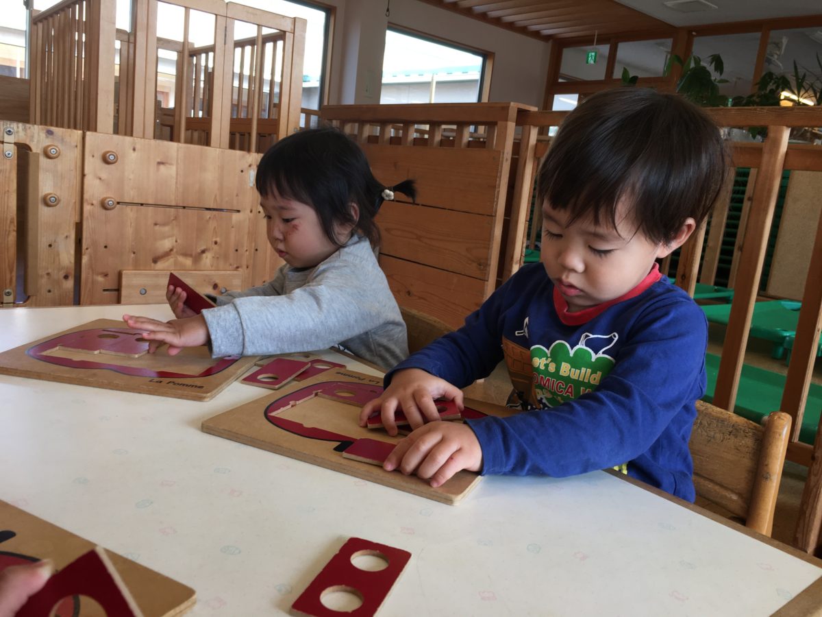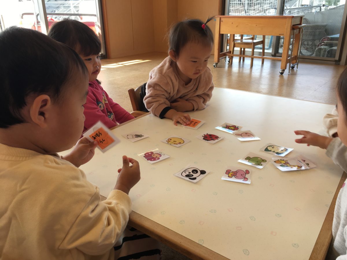 日常生活の中でよく見る自分のマーク。帽子やタオルかけ、自分のロッカーには子どもたちそれぞれのマークが貼られています。子どもたちはそのマークを見て、自分のロッカーからタオルを取りタオル掛けにかけたり帽子を手に取ったりします。4月から毎日自分のマークを見ている中で、自分のマーク以外にも、お友だちのマークも少しずつ興味を示してきているようです。そんな様子から、個人マークのイラストカードを置いてみることに。見覚えのあるイラストに早速子どもたちも「なになに?」「これみたい!」と机に集まってきました。伏せられたカードをめくると・・・「あ!これ○○ちゃんだ!」とこんな声が。更にさらにめくっていくと「あったー!これ○○ちゃんのだよ」と自分のマークを発見!そんな様子を見ていた周りのお友だちもマーク探しに夢中。「これちがう」「これかな?」と探していると「あった!」と無事発見!「○○ちゃんはおはなだよ」「どんぐりー!」とお友だちとカードを見せ合いながら楽しそうに会話をする子どもたちでした。