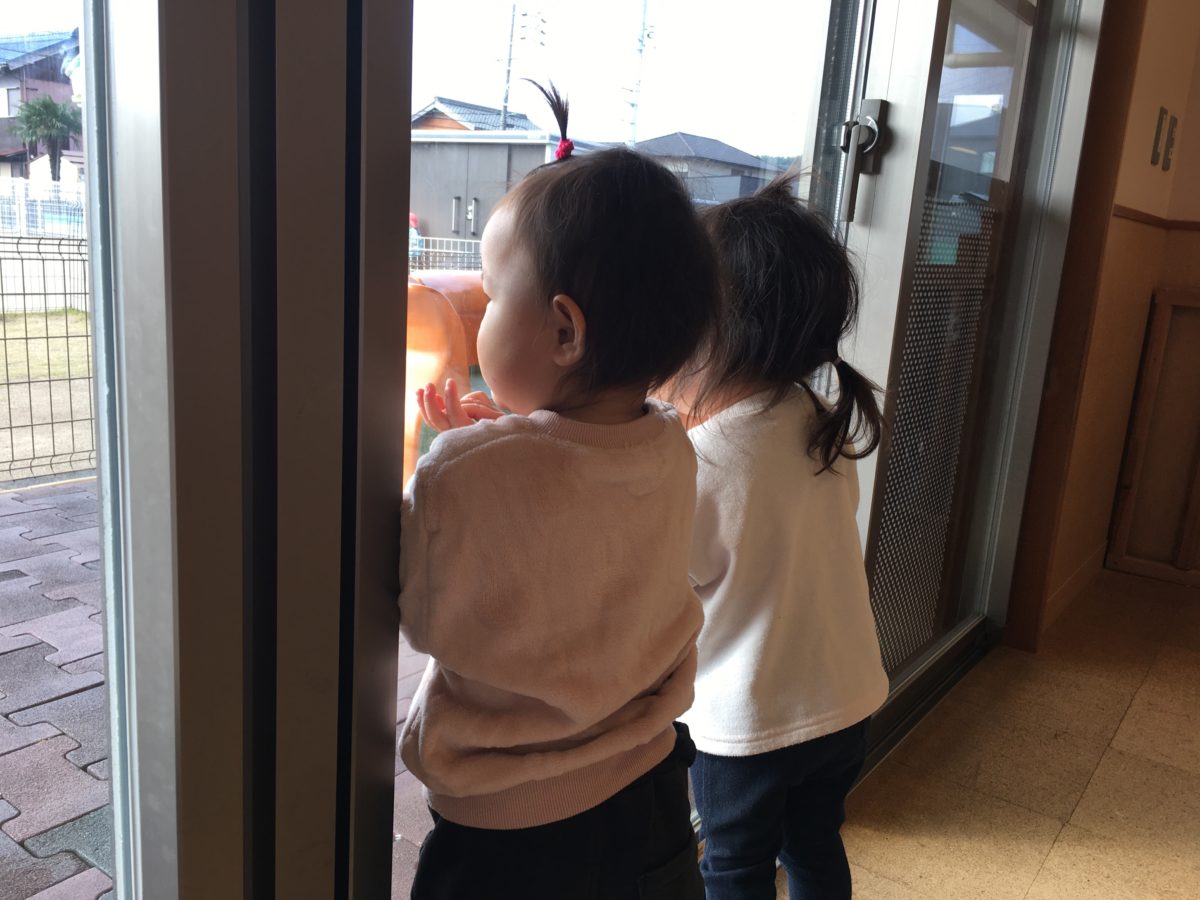一方園庭では、バランスボールに挑戦中のお友だち。赤いバランスボールが置いてあると時には取り合いになってしまうほどの大人気。お友だちと「どうぞ」と貸し借りをしながらバランスボールに挑戦するのですが、なかなか足が届かず苦戦中の子どもたち。一生懸命フェンスにしがみつきバランスボールに乗ってみようとするのですが、思うように跨げずころころとボールが転がっていってしまいます。転がっても何度も何度も挑戦していると・・・・「お!」と無事バランスボールに跨ぐことができました!まだ弾むことは難しいようですがバランスボールに跨げたことにとっても嬉しそうな笑顔を見せてくれました。日々様々な事に挑戦子どもたちの姿を大切に見守っていきたいですね。