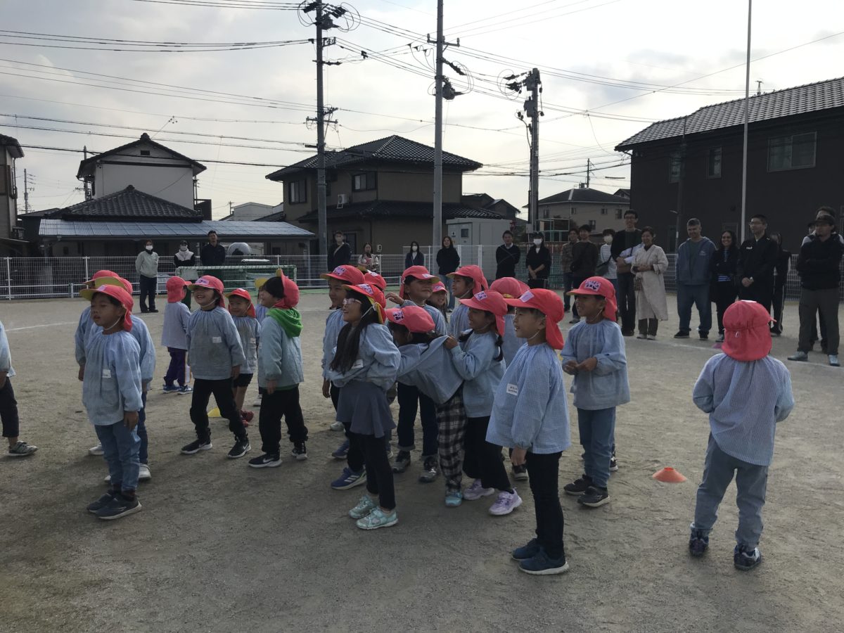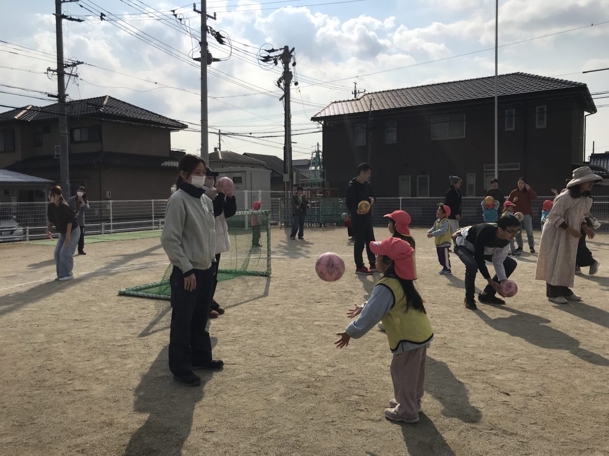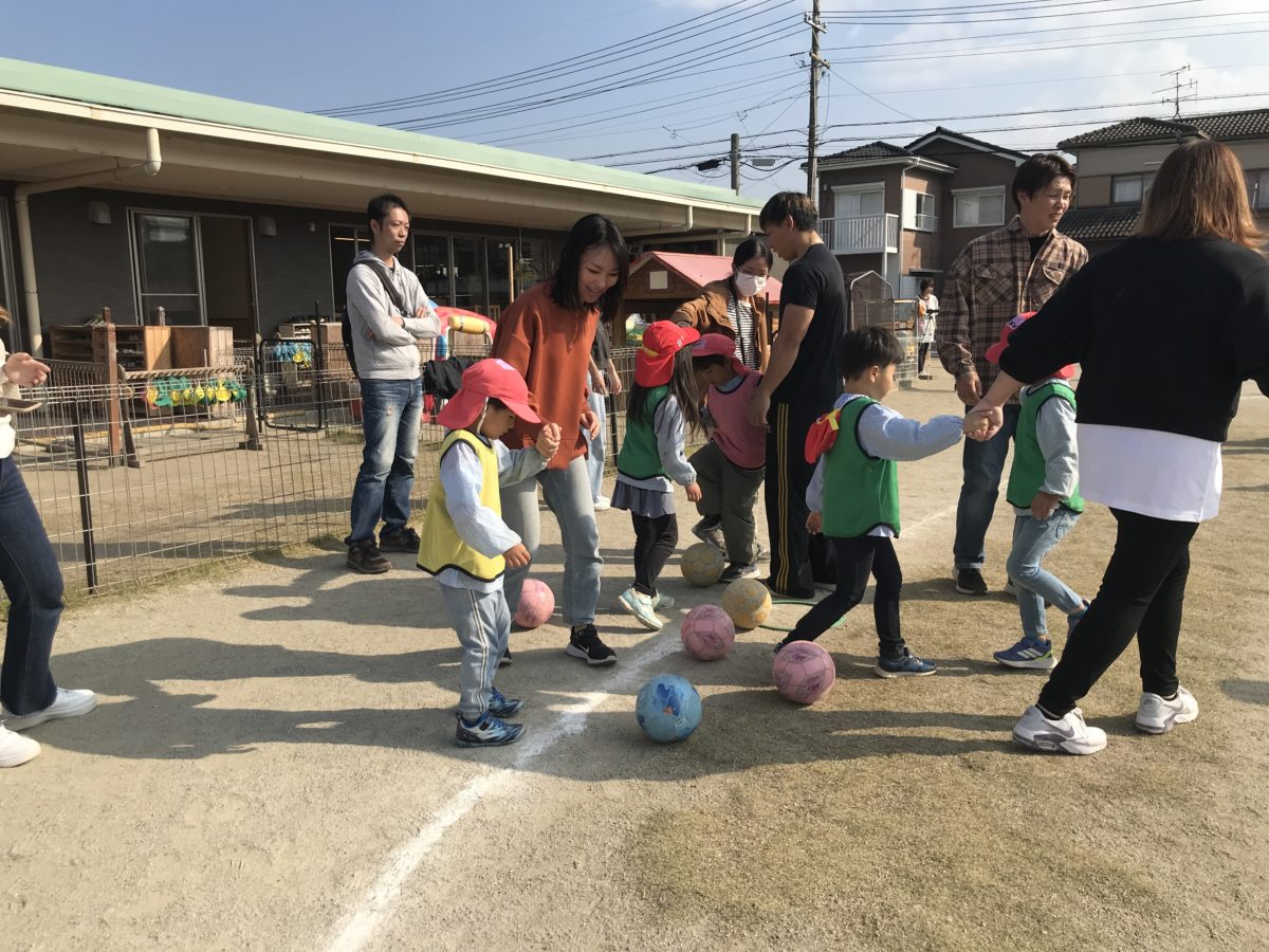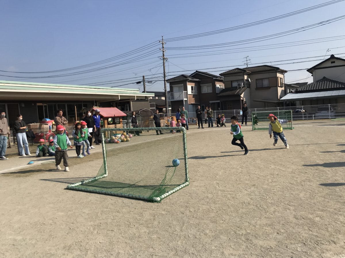「きょう、おかあさん、おとうさんといっしょにサッカーするんやんなー!」「いつ、はじまるのー?」「まだー?!」とウキウキな様子の子ども達。『おねがいします!』とお家の方と一緒にサッカー教室が出来る事に喜びを感じながらスタートしました。番号や動物、お菓子の名前が付いたカラーコーンの周りをまわるウォーミングアップでは、「きいろがいちばん!」「みずいろがぞう!」と自信満々に回る姿はとても頼もしく、子ども達の覚える力には毎回驚かされます。また、以前のサッカー教室でやったことのあることは「こうやで!」「ちがうところからもってきてもいいいんやでー!」とお家の人に教える様子がありました。最後の試合形式では、みんな全力で取り組んでいたので、負けて悔しい気持ちやルールを守ってほしい気持ち、一番にゴールしたい気持ちなどそれぞれ色々な思いがありましたが、みんな最後まで諦めなかったり、サッカー教室の中でコーンやボールの数を数える時もコーチに言われるよりも前に「かぞえよ!」「なんこあった!?」と自分たちで数を数えたりと素敵な姿をたくさん見ていただけたことと思います。お家の人がたくさんいて、子ども達の様子が普段と違う部分もありましたが、自分達で考えながら動く姿がさすがめろん組さん!これからもそんな子ども達の成長を見守っていければと思います。