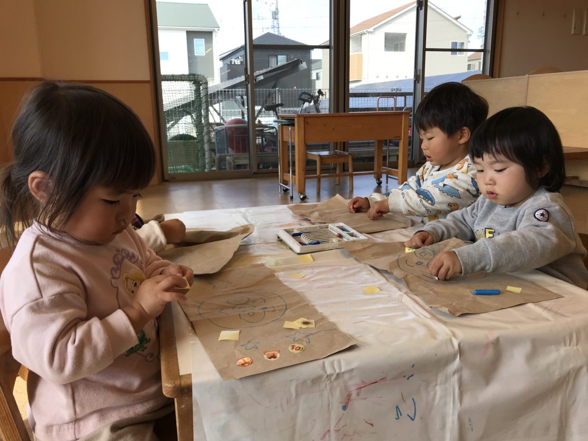 シールペタペタ。クレヨンでお絵描き。