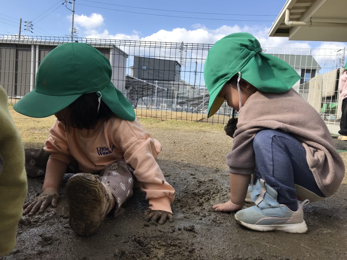 一方園庭では、昨夜の雨で柔らかくなった土にみんな大興奮。靴を履き園庭へ行くと、全身泥まみれになりながらとっても楽しそうに泥遊びを楽しんでいました。段々と手先を器用に使えるようになってきている様子で、手いっぱいに泥をかき集め、ぎゅっと握りながら泥団子作りをする姿もありましたよ。
