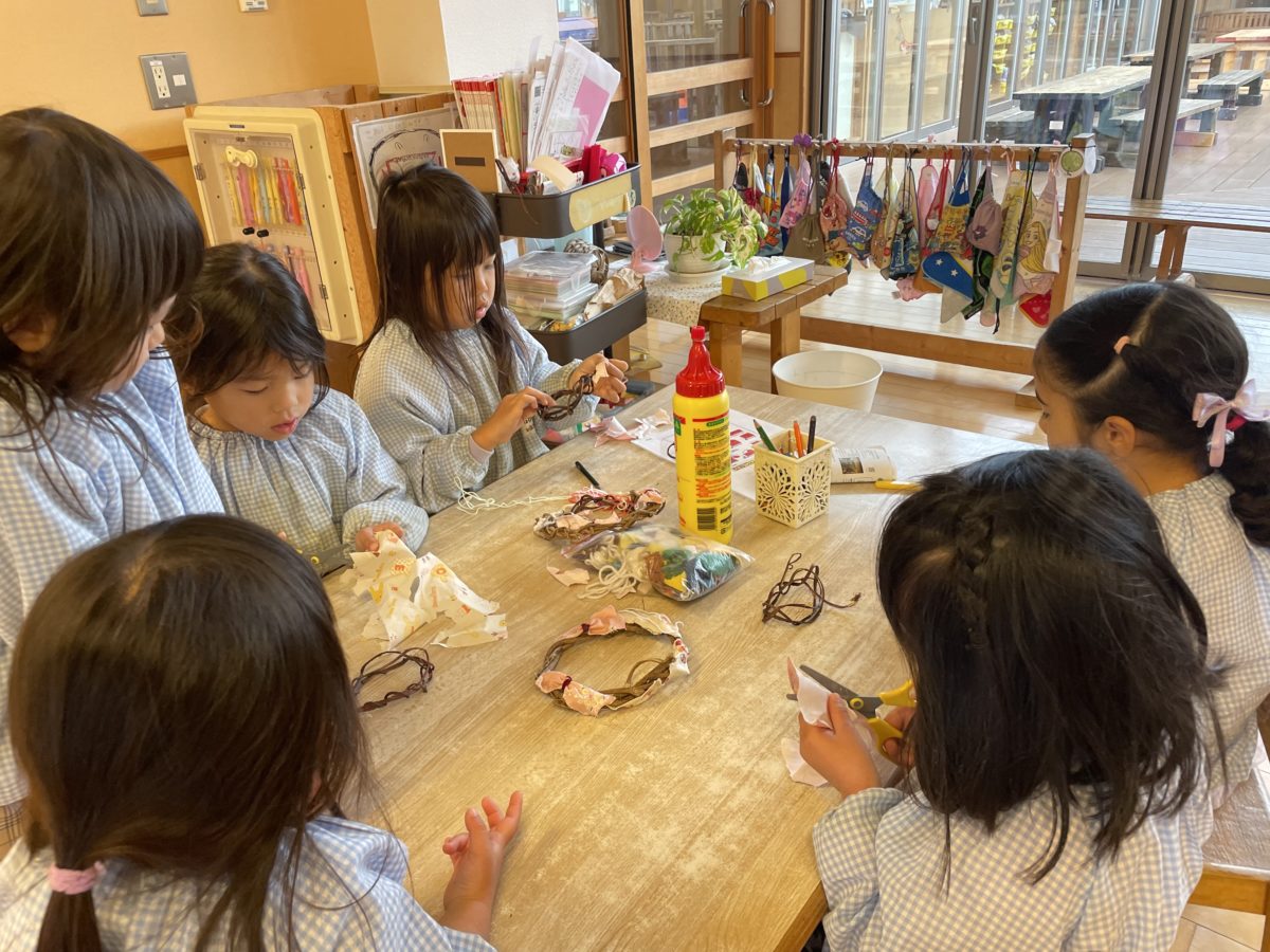 お部屋では、クリスマスのリース作りやクリスマスの折り紙などで盛り上がっている子ども達。さつまいものツルのリースがあったのでリース作りができるよう用意してみると「つくりたい!」「やりたい!」と作り始めました。見本のリースにリボンが付いていたためか「リボンつけたい!」と布を長方形に切り、蛇腹折りにしてリボンの形にしようと試行錯誤していましたが、なかなかうまくいかない様子・・。「リボンのかたちにきったらいいんだ!」と閃いたのか、布にリボンを書いてからリボンの形に切る姿がありました。