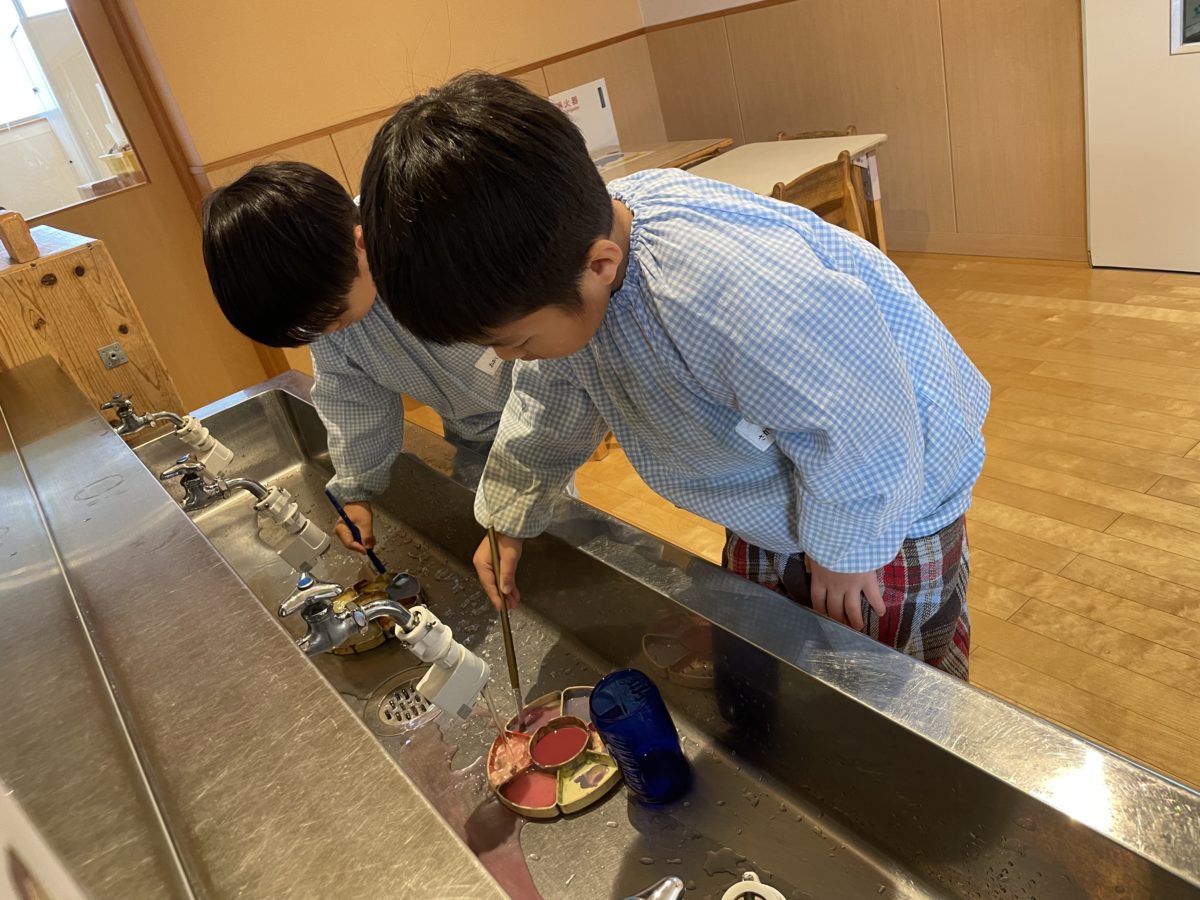パレットを洗っていると「なんかいろがまざった!」「むらさきになっとる!」と驚く声が聞こえてきました。