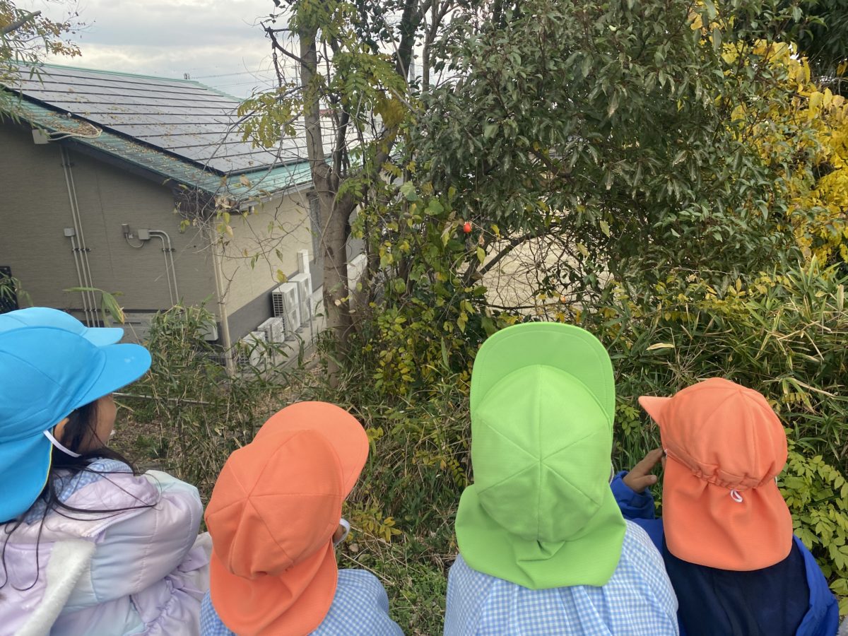河原田神社までお散歩へ出かけました。道中では、「これパンジーっていうんやでー!」と花壇に咲いているパンジーなどのお花を見つけたり、赤色のからすうりを見て「これトマト?!」と観察したりと身近な植物に興味を示す様子がありました。また、もみじやドングリなども見つけ季節を感じながらお散歩ができました。神社に到着するとながーい階段を「よいしょ!よいしょ!」と一生懸命登り、みんなで参拝!りんご組のお友だちも「なんだろう?」と興味津々な様子で参拝している姿を見ていました。
