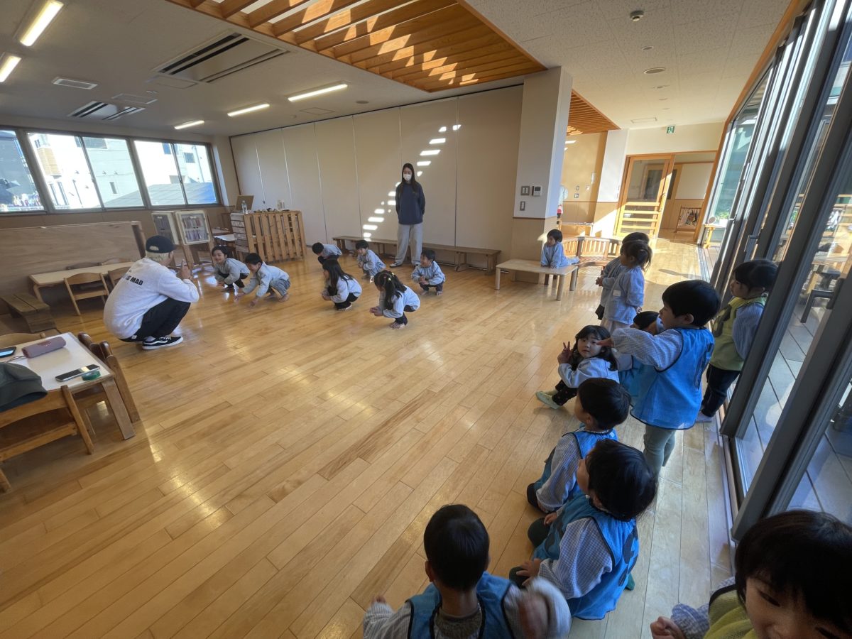 じゃんけんをしていると「チョキだした!」とチョキを出そうとしていましたが少し難しく、苦戦しているとお友だちが「こーやるんやで!」と見せながら教えてくれ、上手にできると「できた!」「もう1回じゃんけんしよ!」と繰り返し楽しんでいました。