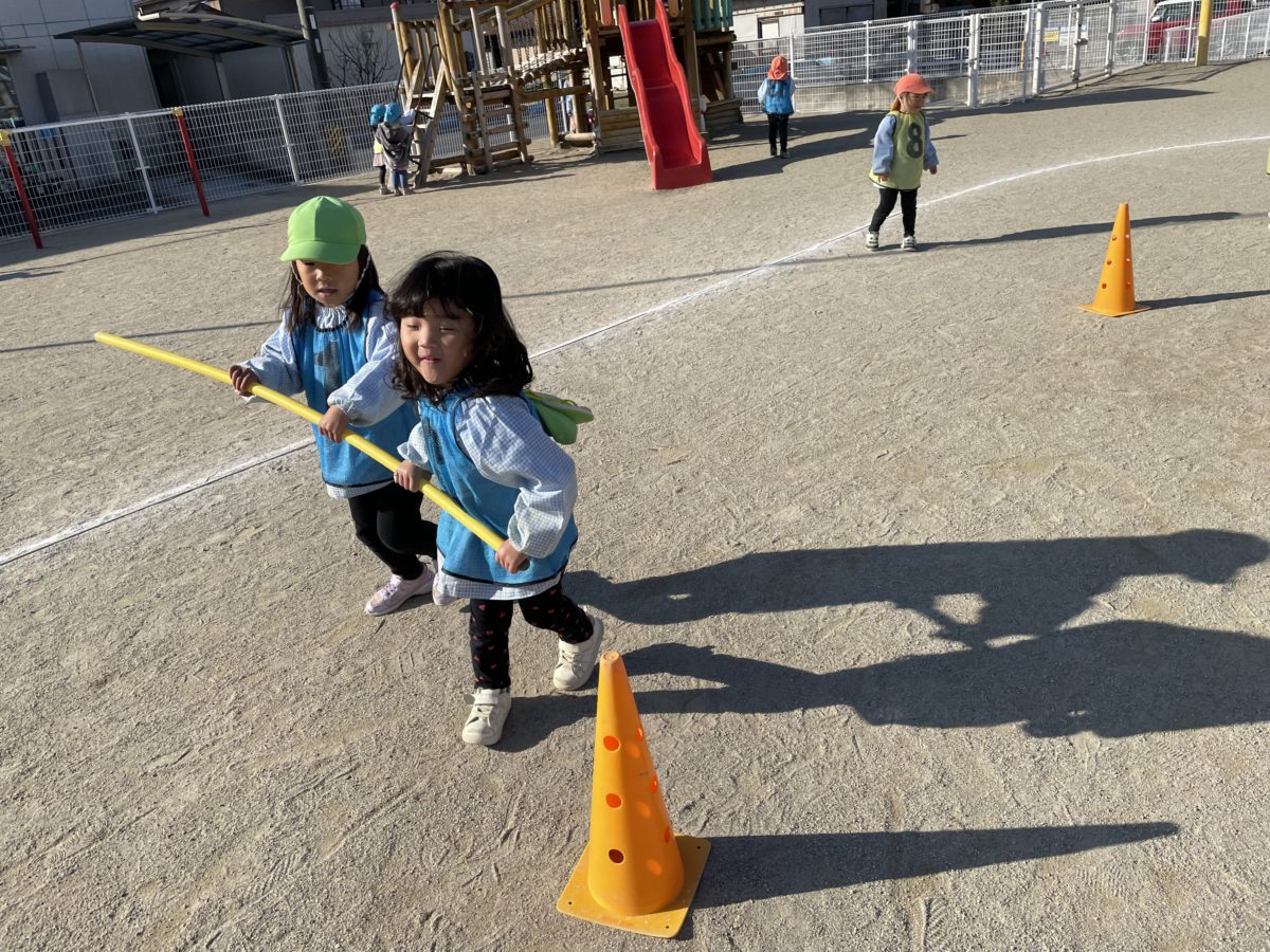 コーンとハードルを使い、障害物競争をしました。いつもはハードルを跳び越えて進んでいくリレーですが今日は棒を持ち、コーンをグルグル!と回って次にバトンタッチ!としていると、「次は○○ちゃんと○○ちゃんだよ!」と自分たちで順番を決めて進めていました。コーンを回るのが難しく、「こっちだって!」「こっち!」とペアの子と一緒に声を掛け合いながら上手く回っていました。
