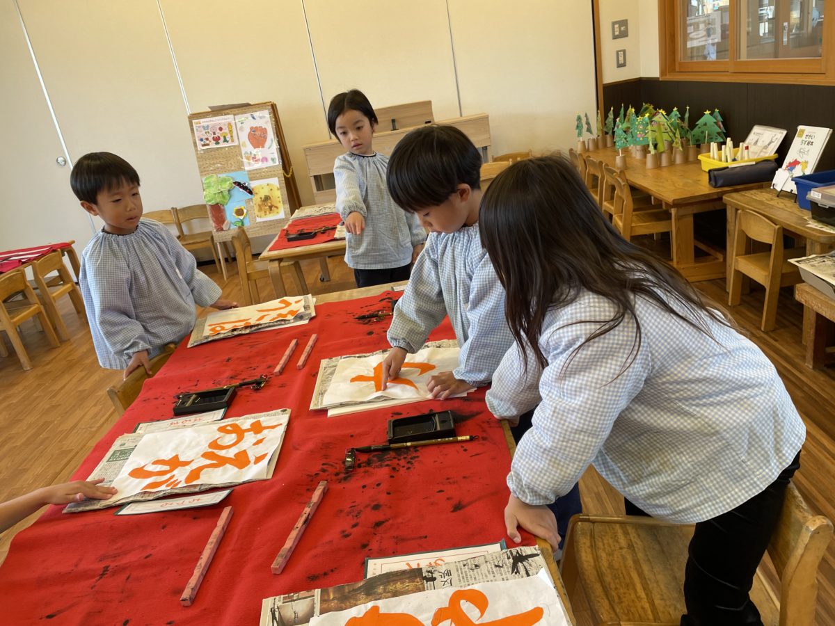 習字教室では、自分の書きたい文字を選んでいると、「力」という漢字を見つけて「これってカタカナの【カ】に見える!」「カタカナじゃないで漢字やで!」という会話が聞こえてきました。漢字とカタカナで似た形があることに気が付いて興味を持っている姿がありました。自分たちで選んだ文字をゆっくりゆっくりと書いて書き終えるともう一枚書きたい!と意欲的に書いている姿がありました。