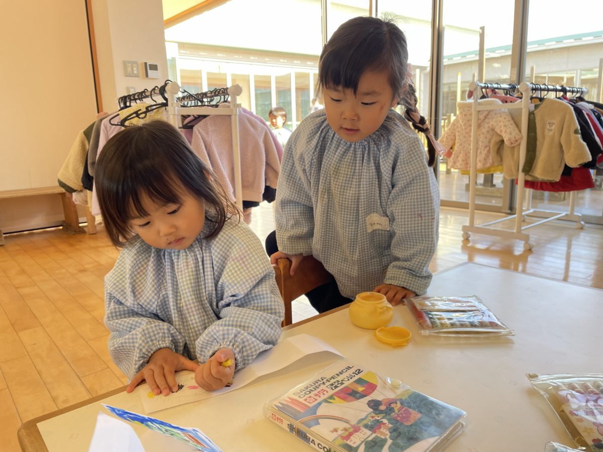 お姉さんお兄さんがやっていることを自分たちもやりたいと話すお友だち。最近立てるツリー作りを大きい子が造って楽しんでいるのですが、そんな姿を見ているりんご組さんもツリーづくりをしたいと、一緒に座ってお姉さんに教えてもらいながら楽しむ姿がありました。「ここはこう?」「あってるよ!」「どうやってすんの?」「ここはね、こっちにまげるの!できる?」「できるよ~!」と話しながら一緒に考えたり、教えてもらったりしていますよ。