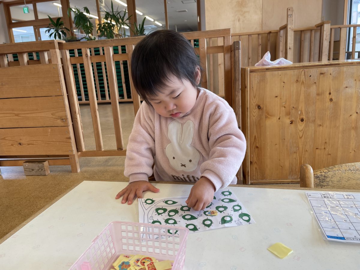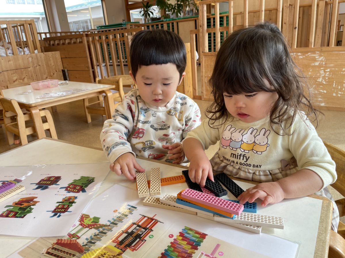 最近では色のついたおもちゃで遊んでいる際に「あか!」「あお!」と色について話す声がよく聞こえてきます。今日は色のついた積み木を準備してみることに。積み木を見つけると、「きいろ!」「オレンジ!」「オレンジ食べたね!おいしいね」と朝のおやつを思い出しながら話す姿や、自分の好きな色だけを取って並べたり、色々な色を取って並べて遊ぶ姿がありました。並べて遊んだ後は組み立てるのに挑戦!見本のイラストを見ながら「これ、こうやで!」「みて!」とお友だちと話しながら作っていたり、指を差して「アーアー」とブロックが置いてある場所を教えていました。何度か途中で崩れたりもしましたが、完成した際には「できた!」と嬉しそうに微笑みながら教えてくれる姿がありました。