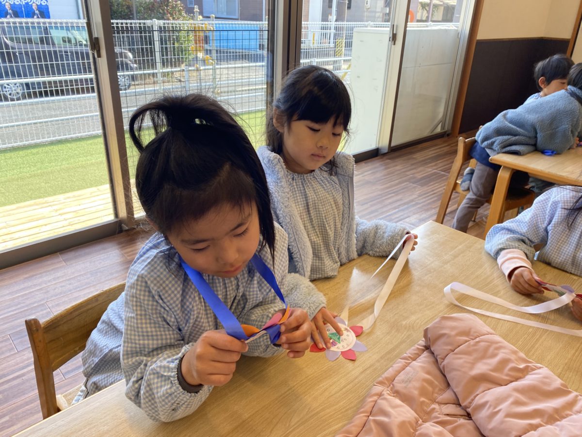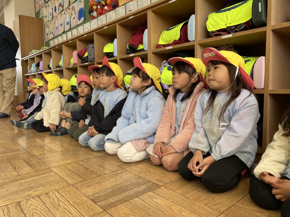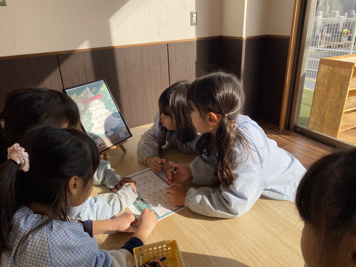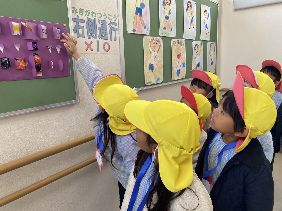 12月はたくさんの行事があるめろん組さん。「19にちはクリスマスかいやで!」「おたよりちょうにシールはってあったもん!」「きのうは、のうげいこうこういったよなー!」とカレンダーに書き込んでいくと、「きょうは、しょうがっこうにいくんや!」「たのしみ!」と小学校に行くのを楽しみに待つ声が聞こえてきました。河原田小学校さんとの交流会に出発する前に『小学校でのお約束』についてお話ししました。「しょうがくせいはじゅぎょうしてるから、しずかにしやなあかんー!」「がっこうで、はしらない!」「せんせいのおはなしをきくー!」などたくさんの約束事ができて、みんなで約束を守ろうと意識する姿がありました。いざ、小学校へ出発!ワクワクと少し緊張した表情を浮かべながら歩いているとすぐに小学校へ到着!「○○ちゃんおる!」と前のめろん組さんや知っているお友だちがいることで少し安心した様子を見せていました。さっそく1年生の教室に行き授業の様子を見せていただき、「しずかに・・」「なにしてるのかなー?」「どんなことするんだろう?」と興味津々な様子で見ていたり、1年生が手を挙げて発表する姿やお友だちのお話をしっかりと聞く姿などを真剣に見て刺激を受けている様子がありました。その後は小学生の皆さんと一緒にじゃんけん列車やまねまねゲームに挑戦!はじめは緊張して戸惑ってしまう様子がありましたが、小学生の皆さんに優しく声を掛けてもらったことで安心したのか楽しくゲームに参加していました。帰り道では小学生のみなさんにもらったペンダントに書いてあるメッセージを読み、「はやくしょうがっこういきたい!」と小学校に行くのを待ち遠しく思う様子が見られました。
