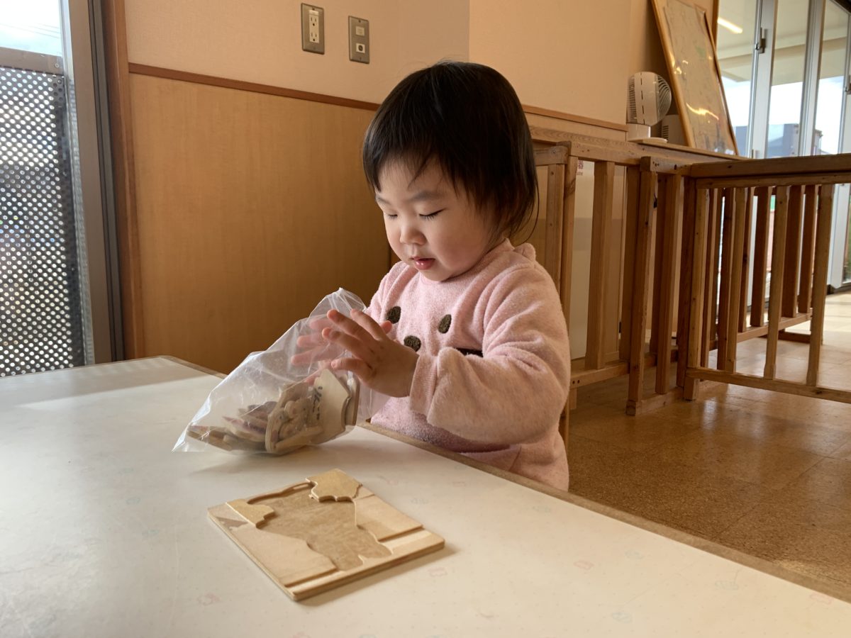 パズルで遊び終わると、近くにあった袋の中に自分でお片づけをしてました。