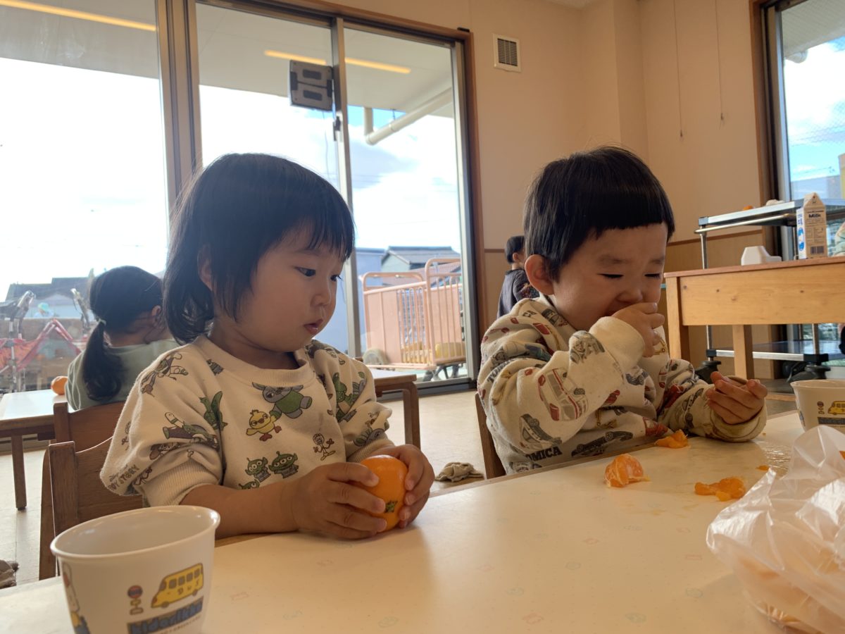今日のおやつはみかん。1歳児のお友だちはみかんに指をさしこみ、皮をぺりぺり・・・少しずつ剥いていくと、近くにあるごみ袋の中へ皮をぽい!それを見ていた隣に座っている0歳児のお友だちも”どうやってするのかな・・・?”とじっと見ています。真似をするようにみかんに指をさそうとしたり、皮をつまんでみたりと、自分で考えながら皮むきに挑戦していました。保育士がすぐに声を掛けたり、手を貸したりせず子どもたちを見守っていることで、自分でやってみよう!と出来ることが増えたり、お兄さんお姉さんの真似をしてやってみようと頑張る姿が少しずつ増えてきましたね。