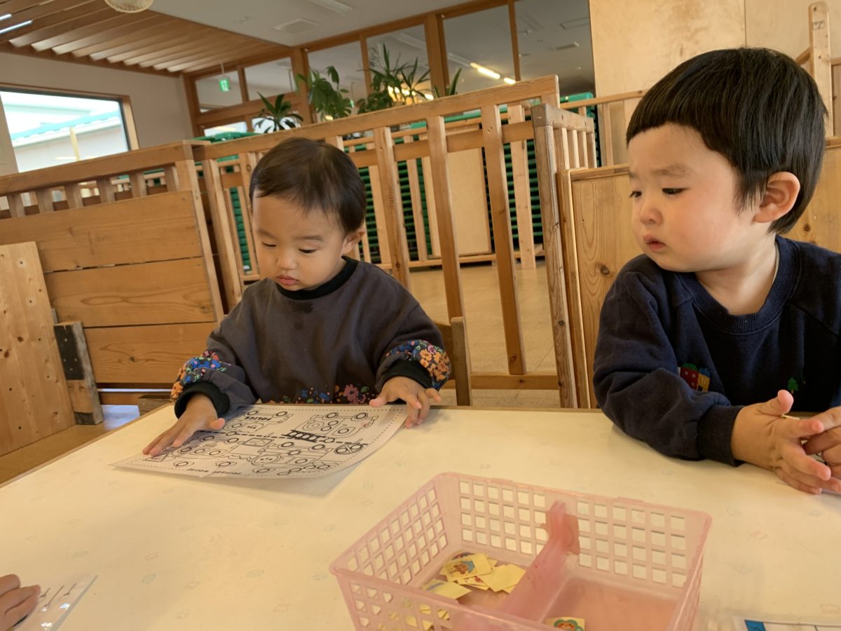 指先が上手に使えるようになってきて、細かいおもちゃや遊びに興味津々のいちごぐみさん。パズルやシールなど、それぞれ好きな遊びを用意し、保育士がシールの台紙の準備していると、なにしてるのかな?というようにのぞき込んだり、近くに座り始めました。「しーる!」とすぐに気づき、遊び始めると、車の台紙に注目・・・「これは、きゅうきゅうしゃ!」「これは、ぱとかー!」と知っている車の名前を言葉にしながら丸いタイヤの部分にシールを貼っていきます。クリスマスリースのイラストをシール台紙代わりに置いておくと、リースを飾り付けるようにひとつひとつ貼り付けていきます。ぐるっと一周飾りつけができると、「みてー」と満足そうににっこり!素敵なクリスマス飾りのできあがりです!