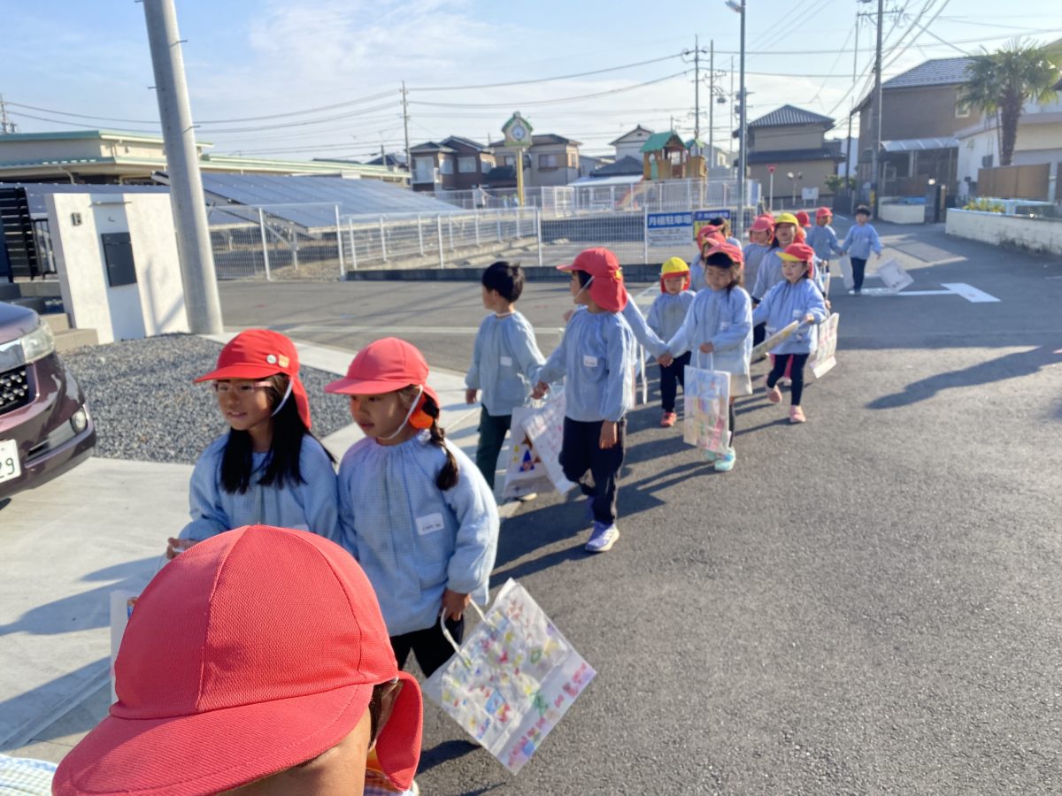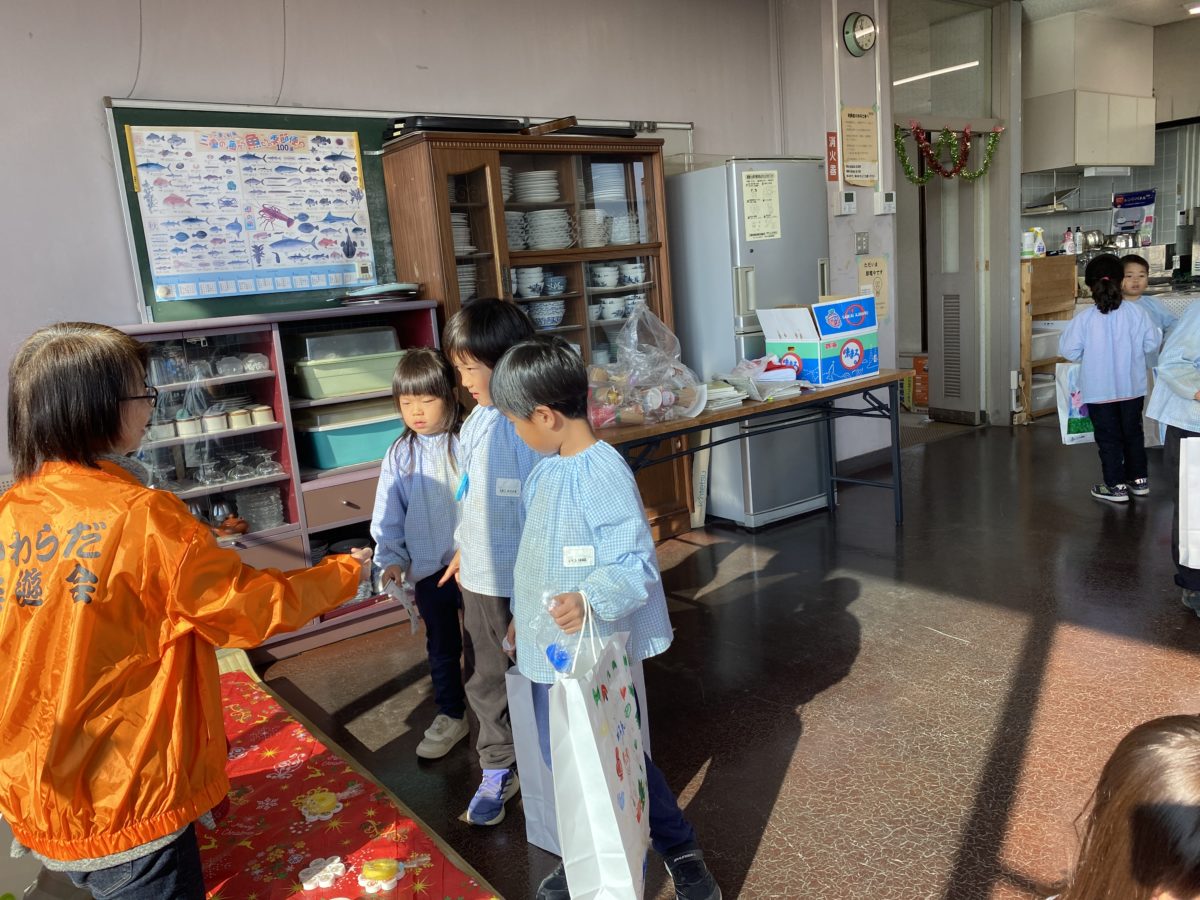 先日からすくすくサロンに持っていく紙袋をクリスマス仕様にデコレーションをしていた子ども達。「きょう、すくすくサロンや!」「たのしみ!」「プレゼントもらえるんかなー?」と楽しみにしながら河原田地区市民センターへ出発しました。建物が見えてくると「ここきたことある!」「おもちつきしたで!」と会話を弾ませていました。いざ、お部屋へ入るとたくさんのプレゼントが並んでおり、みんな大喜び!「うわー!いっぱいある!」「ピカチュウのおりがみある!」「これなんやろ?」「これけーき!?」「かわいいー!」と興味津々でした。お買い物ごっこでは、ペットボトルの蓋をお金に見立ててプレゼントと交換!「これほしい!」「おかねどうぞ!」と好きな物と交換して楽しんだり、「このおはな(花)かわいいから、おかあさんにあげる!」「これおにいちゃんにあげる!」と自分が欲しいものだけではなく家族の方へのプレゼントを選ぶ素敵な姿が見られました。たくさんのプレゼントと交換していくうちにお金が少なくなってきて「あと2つしかない・・」「ほかのところもみにいこう!」と欲しい物をもらうだけではなく、残り少ない大事なお金をどのように使うか悩みながら動く様子がありました。じゃんけんスタンプラリーでは、地域の方とじゃんけんして勝ったらスタンプゲット!すべての枠が埋まるように色々な方に声を掛けにいったり「いっしょにいこ!」とお友だちを誘って一緒にいったりと協力しながらスタンプラリーに挑戦していました。帰り道では「これもらった!」「こんなのもあったよ!」と会話を弾ませながら、たくさんのプレゼントを持ち、嬉しそうな顔で歩いていました。