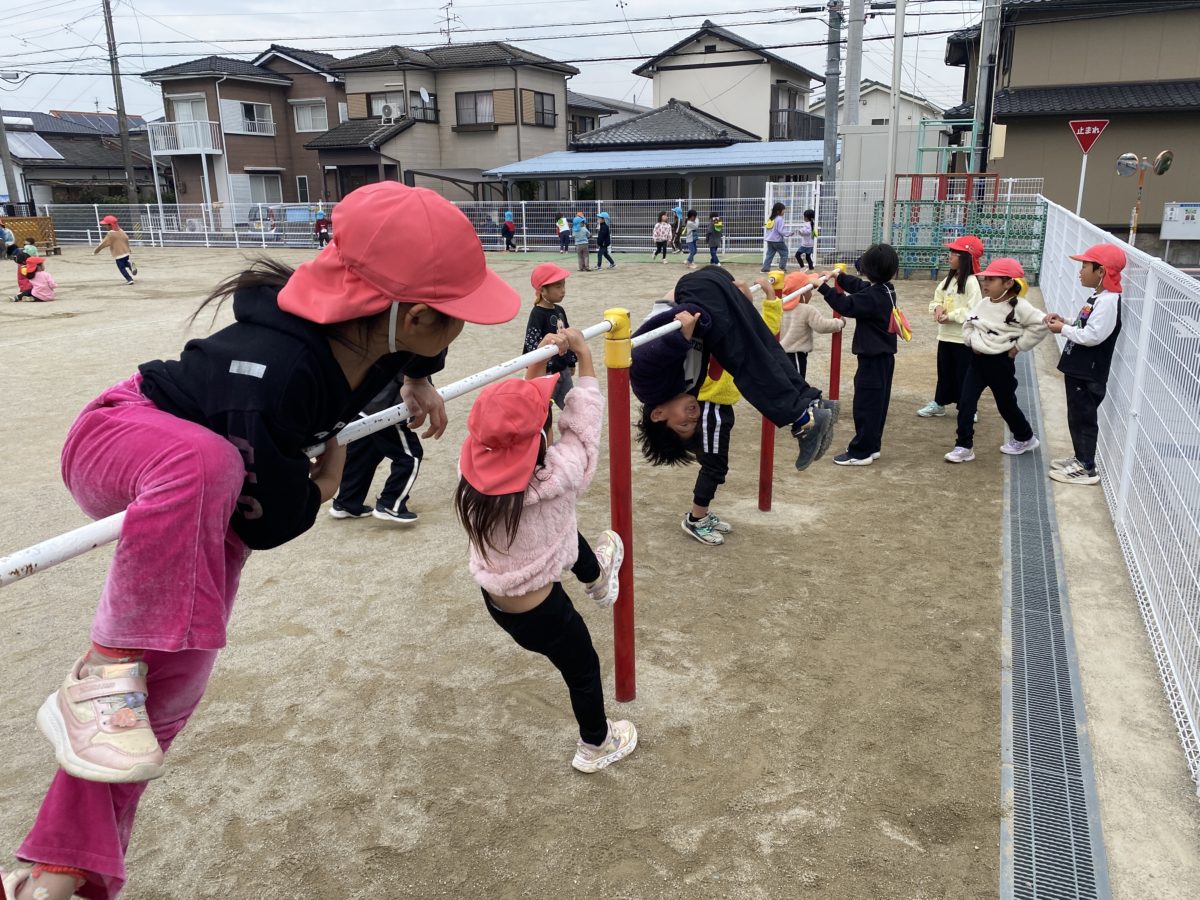 最近鉄棒ブームのめろん組さん。「みとってー!」と前回りや逆上がりなどそれぞれできる技を披露していました。