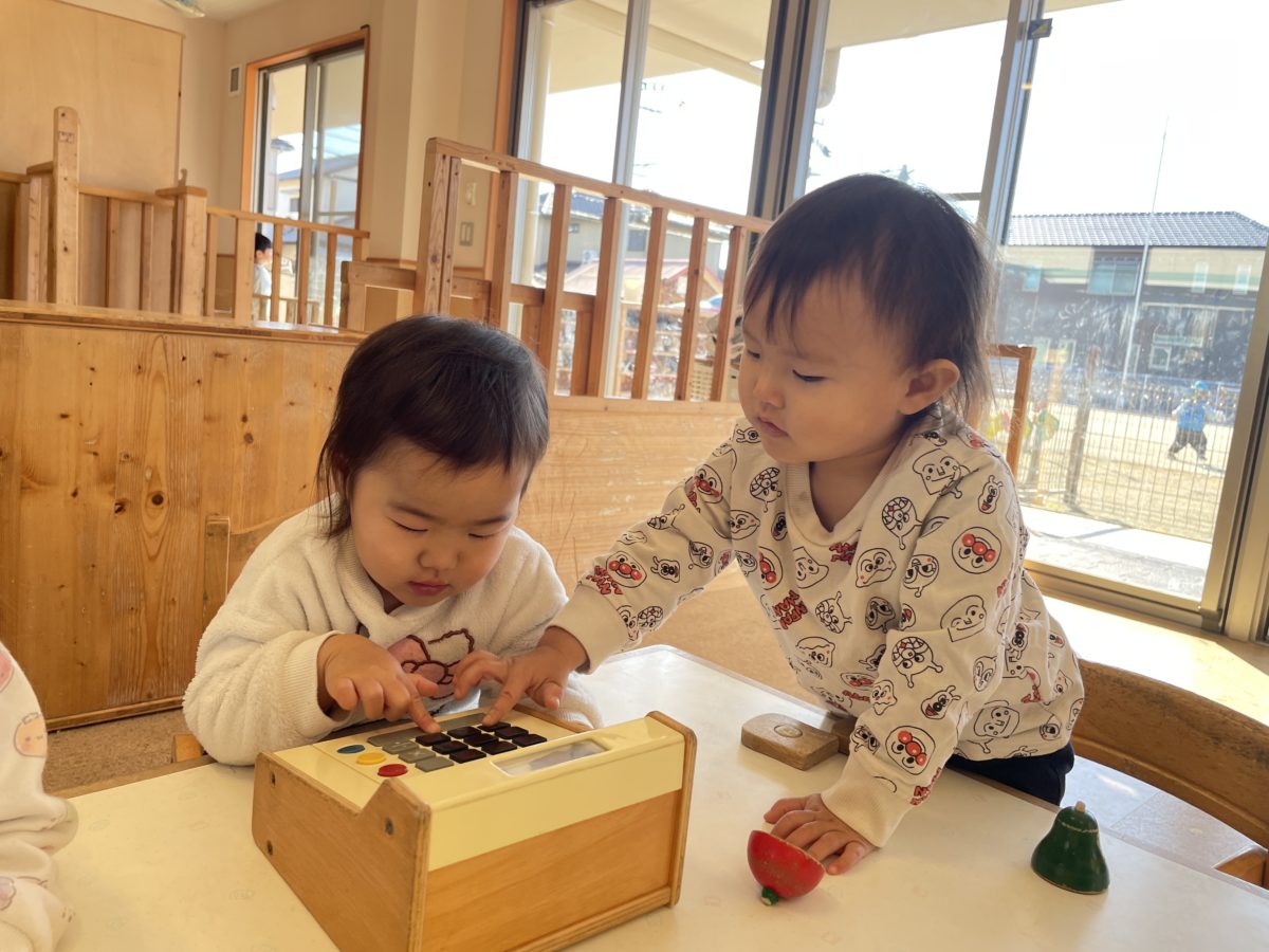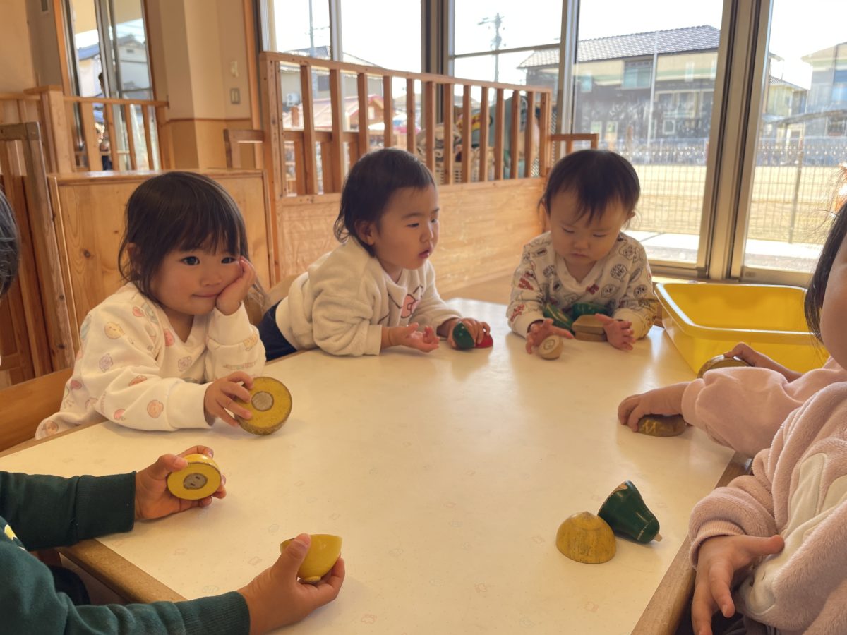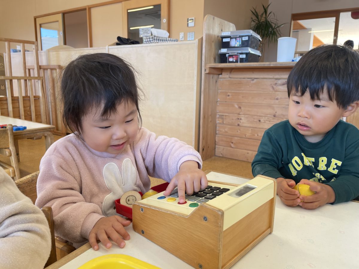 「これなに?」「これなす!」「ばなな?」「パイナップル」だよ何やら楽しそうな会話が聞こえてきます。そっと覗いてみるとそこでは、木製の食べ物のおもちゃを片手に遊んでいる子どもたち。マジックテープや磁石でくっつく野菜をぱかっと離したりくっつけたり。レジスターをピッと押すと気分はお店屋さんの店員さん。別のおもちゃを包丁替わりにし、トントントンと手を動かしながら、楽しんでいました。別の場所では折り紙に夢中な様子。保育士が目の前で黙々と何かを折っていると、その様子を真剣な眼差しで見ています。手先をじっくりと観察しながら真似っこ。折り紙の淵を一生懸命三角に折ろうとしてみたり丸めてみたり。更にはシールをペタリ。「できた!」と一枚の紙を何かの物体に大変身。「○○ちゃんも!」と周りでその様子を見ていたお友だちも真似っこ。お友だちと一緒に折り紙を折りながら真剣な子どもだちでしたよ。