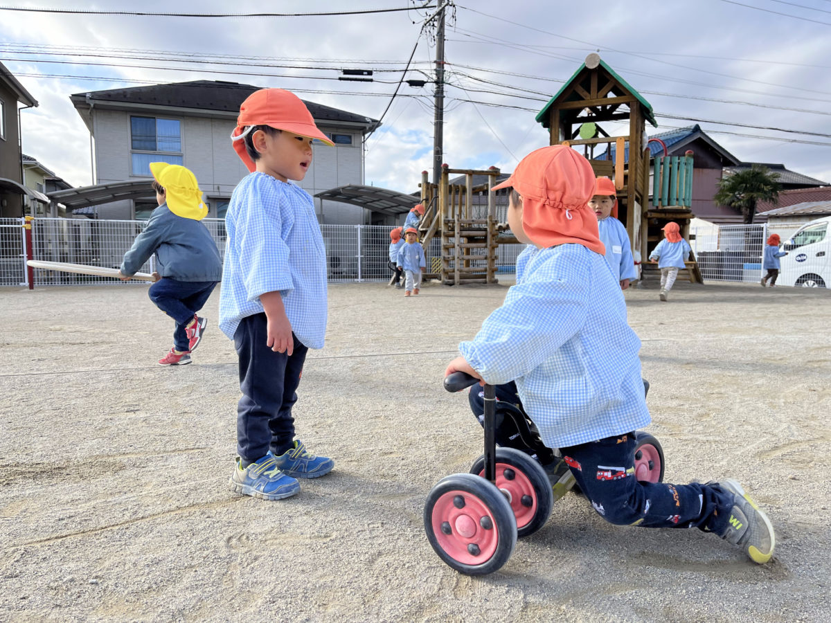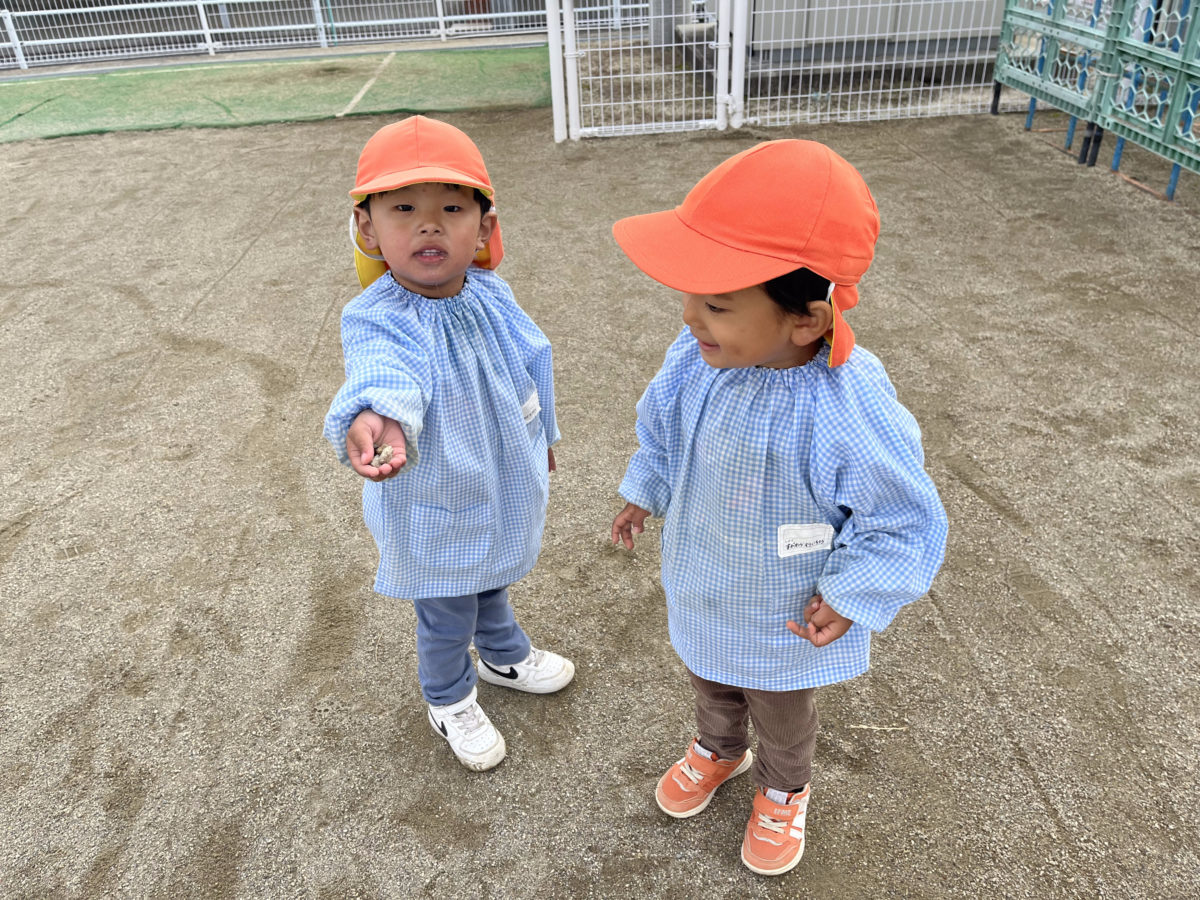 2歳児のお友だちは園庭で見つけた石を手のひらに乗せながら「1,2,3・・・10!!」とりんご組のお友だちも10まで数えられるようになり、「いっぱいあるね~!」と話していました。そして三輪車も楽しむ中で、違うお友だちが寄っていき乗っている子に対し「さんりんしゃ、かーわって!」と言葉にして自分の思いを話し、「うんいいよ!」と三輪車を交代しながら楽しむ姿がありました。少しずつりんご組のお友だちも自分の気持ちや思いを言葉にしてお友だちへ伝えようとする姿も増えてきました。