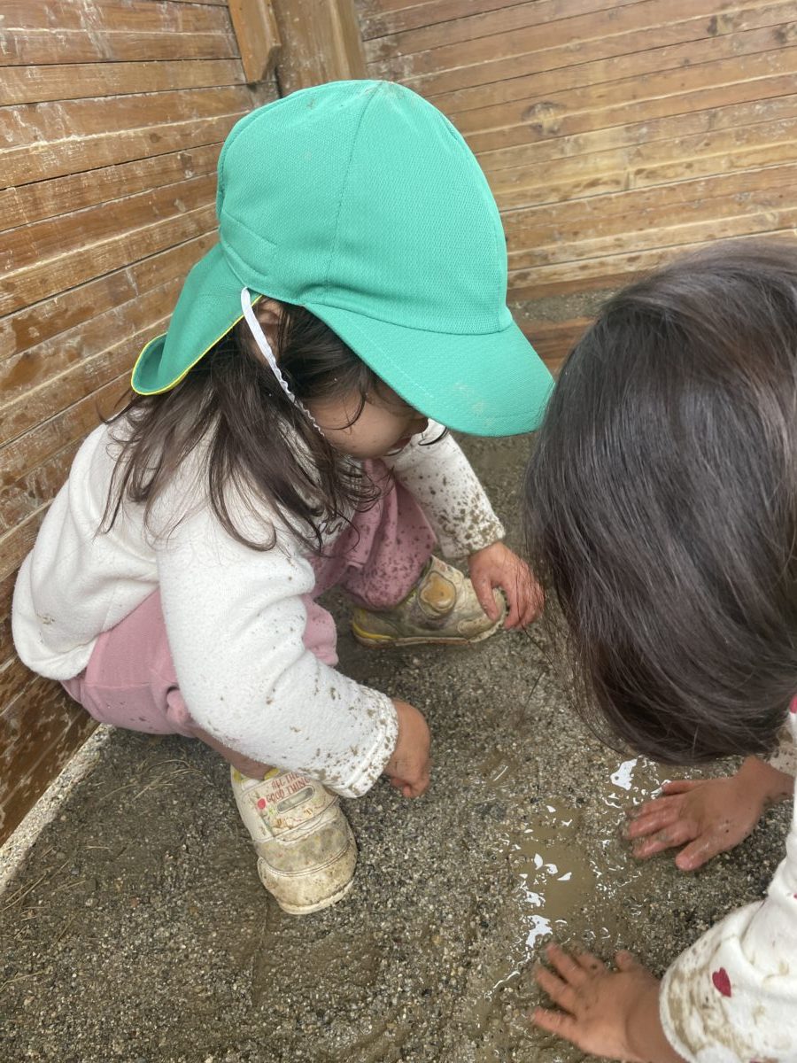 水気を取った地面を手で触ると水がじわじわ出てくるのが楽しかったようでお友だちと一緒にペタペタ‼ 「なんかユラユラしてきた~」とさらにペタペタして楽しんでいました。