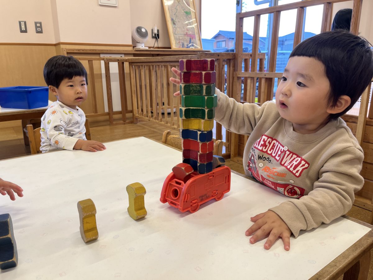 おやつを食べ終えた後は積み木に挑戦!1個1個、そーっとそーっと積んでいきます。グラグラと揺れる積み木を押さえながらどんどん高くなり、自分の身長よりも高くなった積み木を見て嬉しそうに笑う子ども達。「次はどうやって乗せるのかな?」と気になって見てみると、少し身長の高い子が「やる!」と言って積み始めました。最後の1つを乗せようとした時に「あぶないよ」と指を差して崩れそうなのを教えている子や、無事に乗せることができて拍手をして喜んでいる子などとても楽しそうでした。