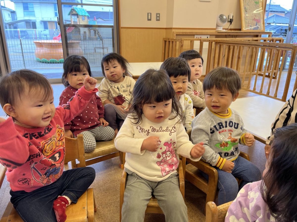 おやつの前に「ゴリラのパン屋さん」の絵本を読んでいると、登場する動物に興味津々な子ども達。ウサギが出てくるとピョンピョンと真似をしたり、タヌキが出てくると「なんだろう?」と考える姿もありました。動物の話から、「ほんとのおおきさ動物園」の絵本のページを開くと、そこには子どもたちの好きなパンダの姿が!「パンダや!」「これやで」とパンダの真似をしながら嬉しそうに話す姿があり、話の途中で「パンダ・ウサギ・コアラ~♪」と1人の子どもが歌うとみんなも同じように歌ったり、踊る姿がありました。また、動物の真似をすることが楽しいようで、ゴリラが出てくると、「ごりら!」「ウホウホ!」と胸を叩く真似をしたり、ゾウが出てくると腕を鼻に見立てて右へ左へとゆっくり振っている姿やお互いの腕を当てて笑い合う姿もありました。