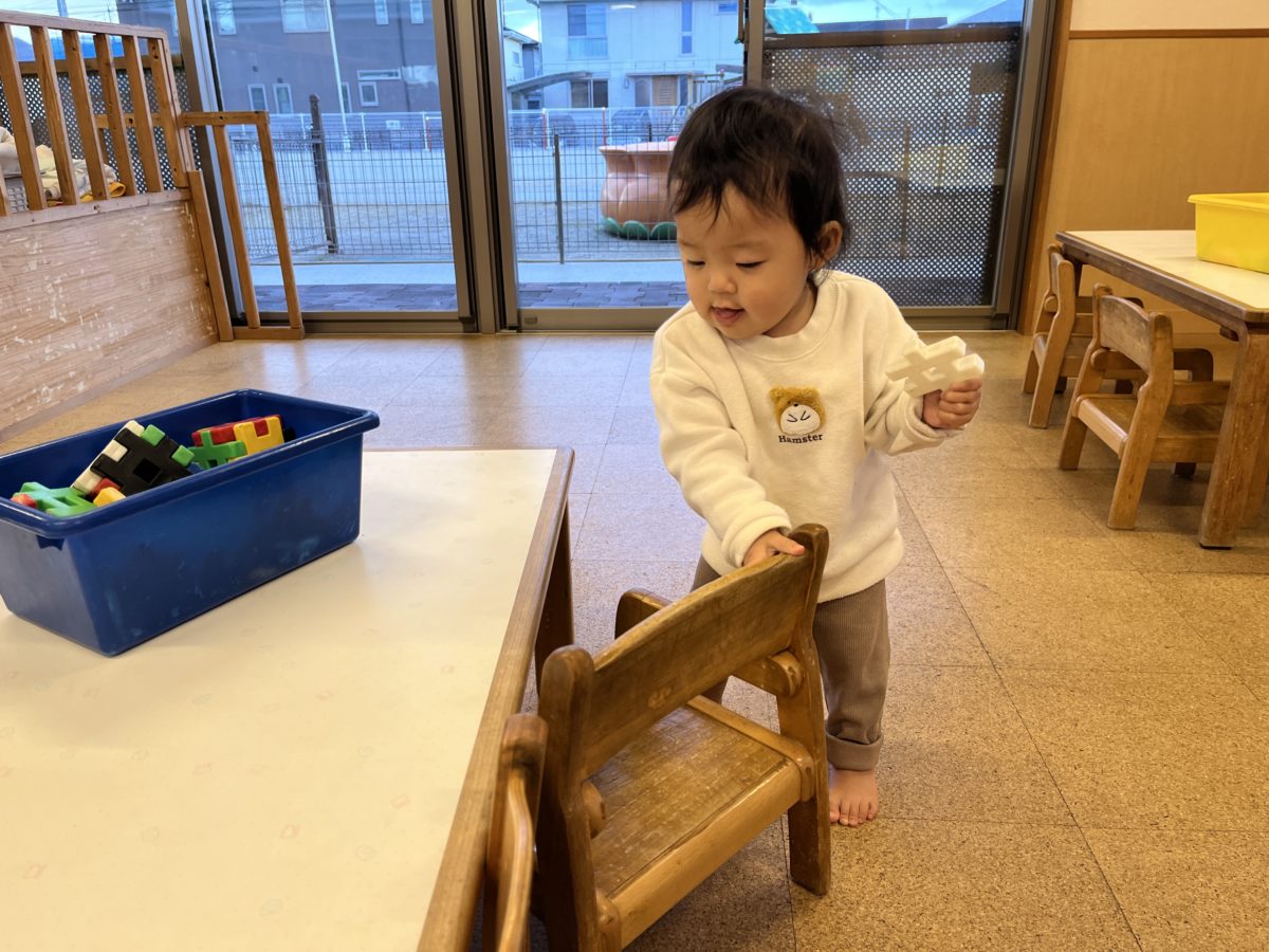 すいか組さんも自分でお椅子を引いて、座って遊ぼうとする姿があります。