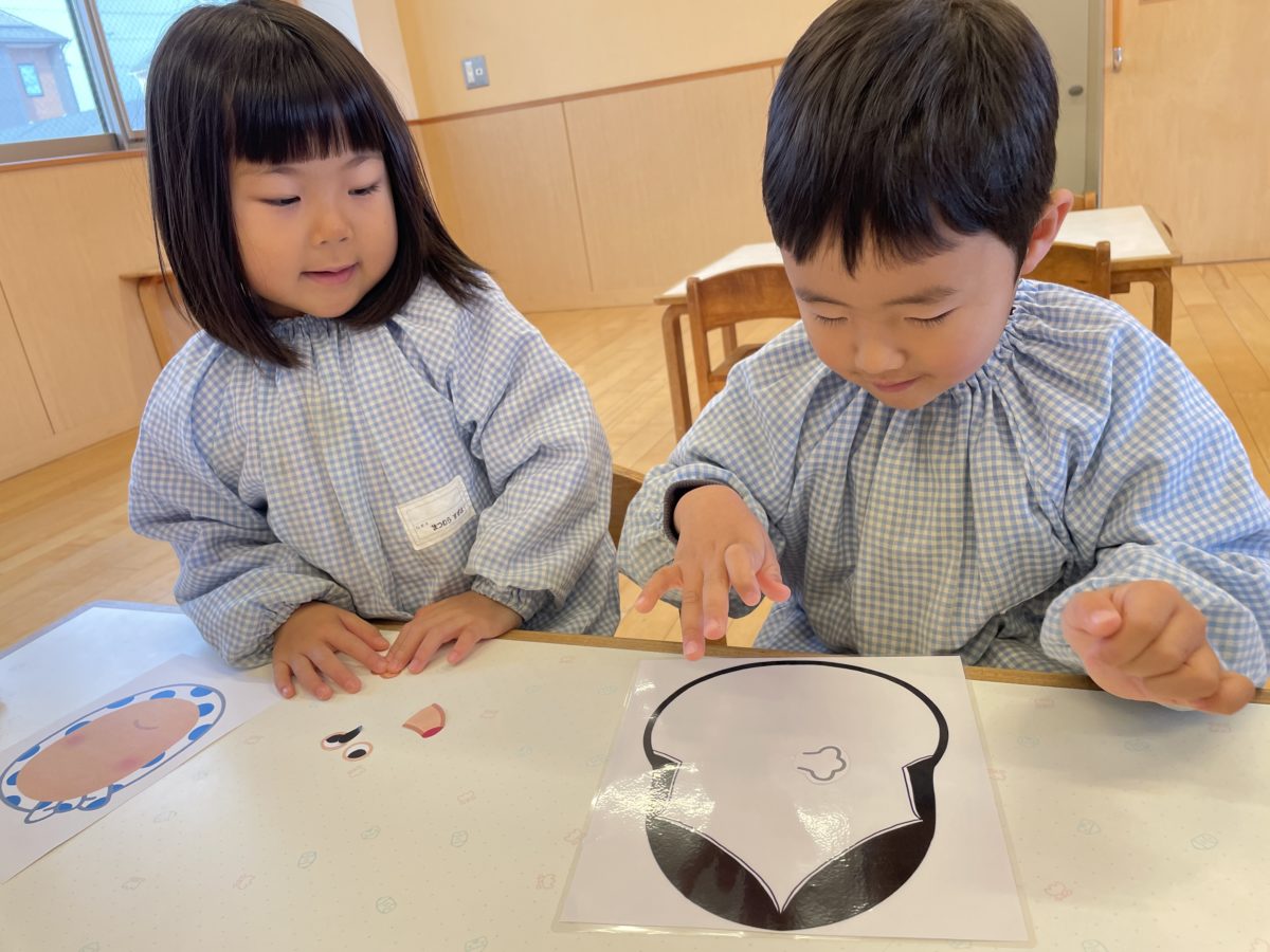 隣の机では「福笑い知ってる?」「面白いよ!お家でやった!」と福笑いの話をしていました。「目つぶってやるよ!」「これ目?」「できた!」「何これ~!」と出来上がった顔を見て「これちがう~」と話していました。