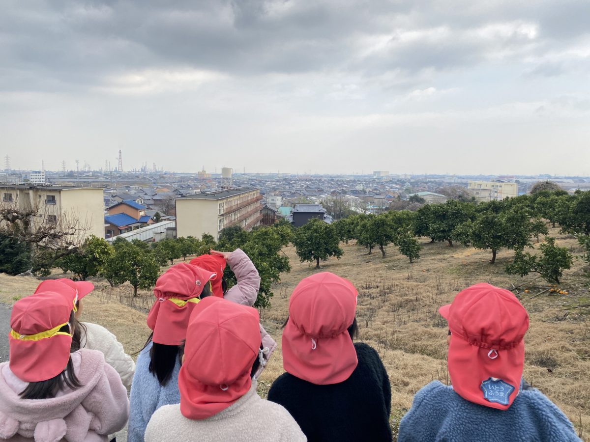 お散歩に行ったお友だちは、神社に参拝に行きました。河原田神社に到着すると「行ったことある~」と言う声が聞こえ、階段を上まで登っていき、列になって順番に参拝を終えると、河原田全体が見渡せるところにいき、「何が見えるかな~?」とみんなで見ていました。「あ!あれ保育園じゃない?」「小学校あったで!」と次々に話しているお友だち。「ぼくの家みつけた!」と自分の家を見つけているお友だちもいて、普段見ない所から自分たちの生活している所を見て色々な物を見つけていました。