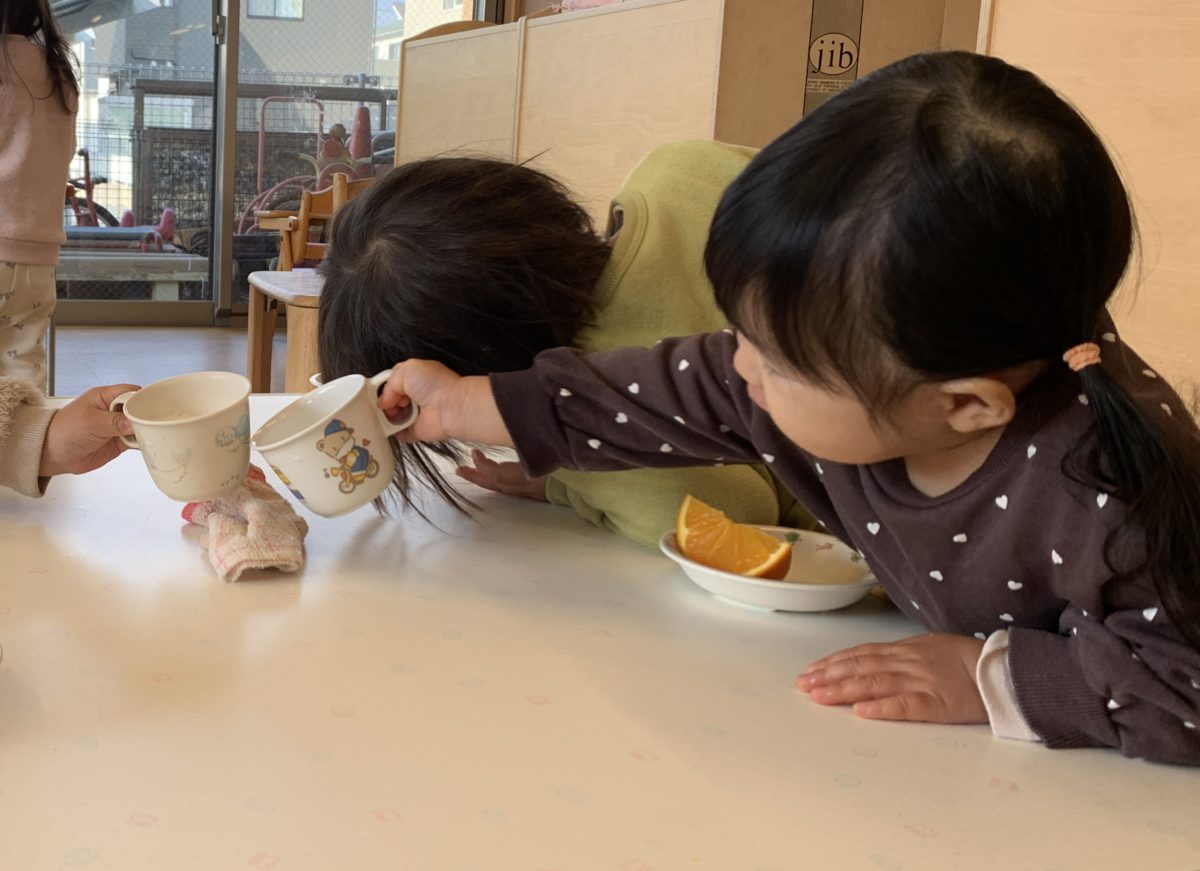 朝のおやつには「かんぱーい!」とコップを合わせていました。お休み中にたくさん乾杯したのかな?