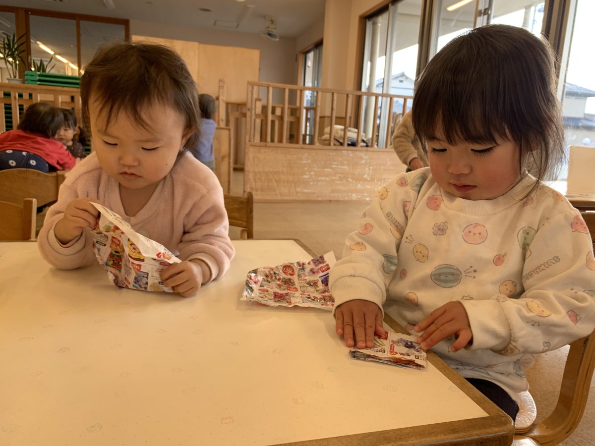 お部屋には小さい子たちでも楽しめるお正月遊び、福笑いを準備してみました。「これ、おめめ!」と目や鼻などのパーツに気づき、「おめめ、ここ!」「ここにしよ!」とお友だちと相談しながら楽しむ様子や、集中して一人で楽しむ子などさまざまでした。「おめめついとる!」と目や鼻のパーツを自分の顔に合わせると、普段との顔の違いがおもしろいようでお友だちと笑いながら楽しんでいて、福笑いだけでなく他の遊び方を見つける発想力の豊かさがとてもおもしろいですね!