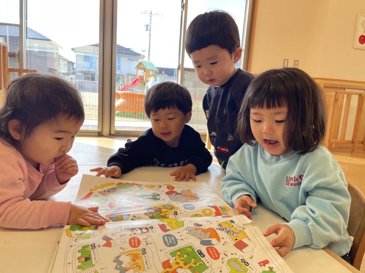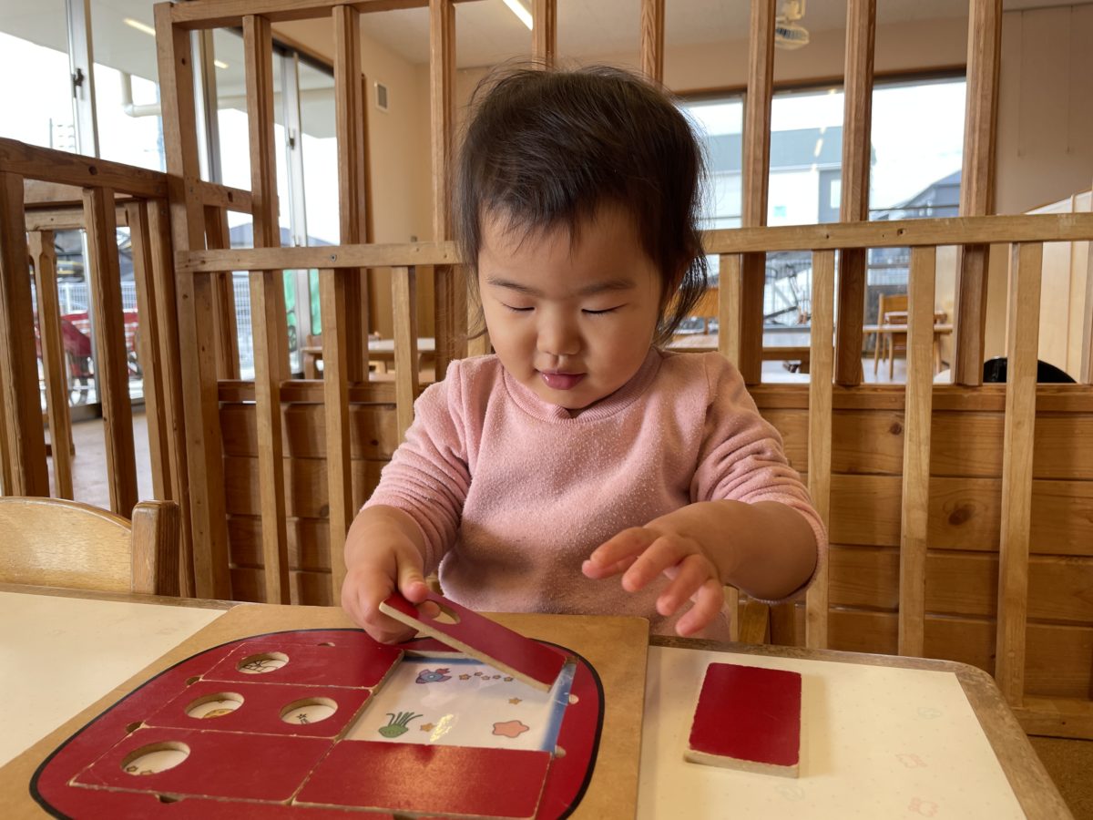 おやつ後はパズルや紐通し、絵本など好きな遊びを見つけると椅子に座り真剣な子どもたち。特に夢中になっていたのが紐通し。穴の空いた色々な形の台紙を手に取ると穴に慎重に慎重に紐を通します。何本もの紐を沢山穴に通すと「できた!」と嬉しそうな表情。その後も色々な形の紐通しに紐を通しながら楽しんでいました。