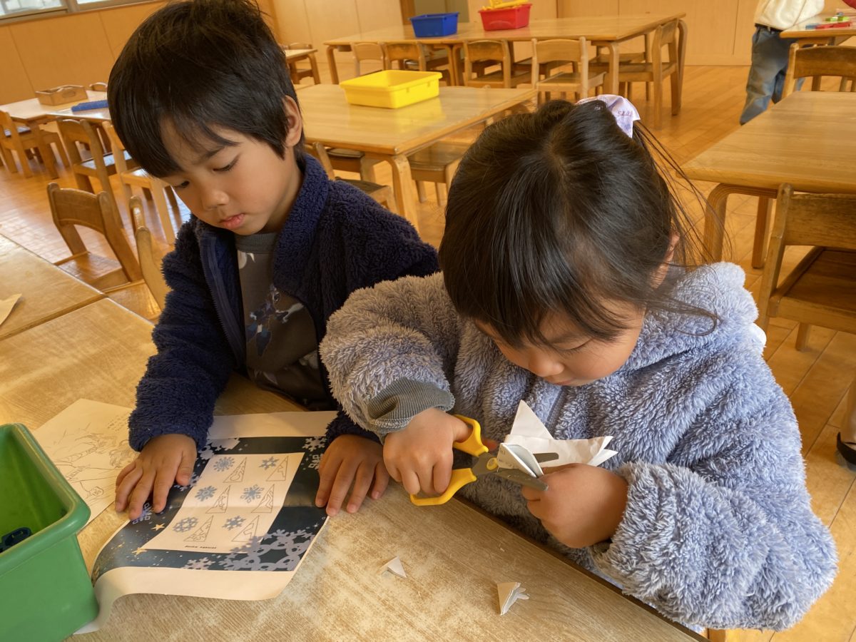 雪の結晶のイラストに目をひかれ、はさみを使って結晶の切り絵に挑戦しました。