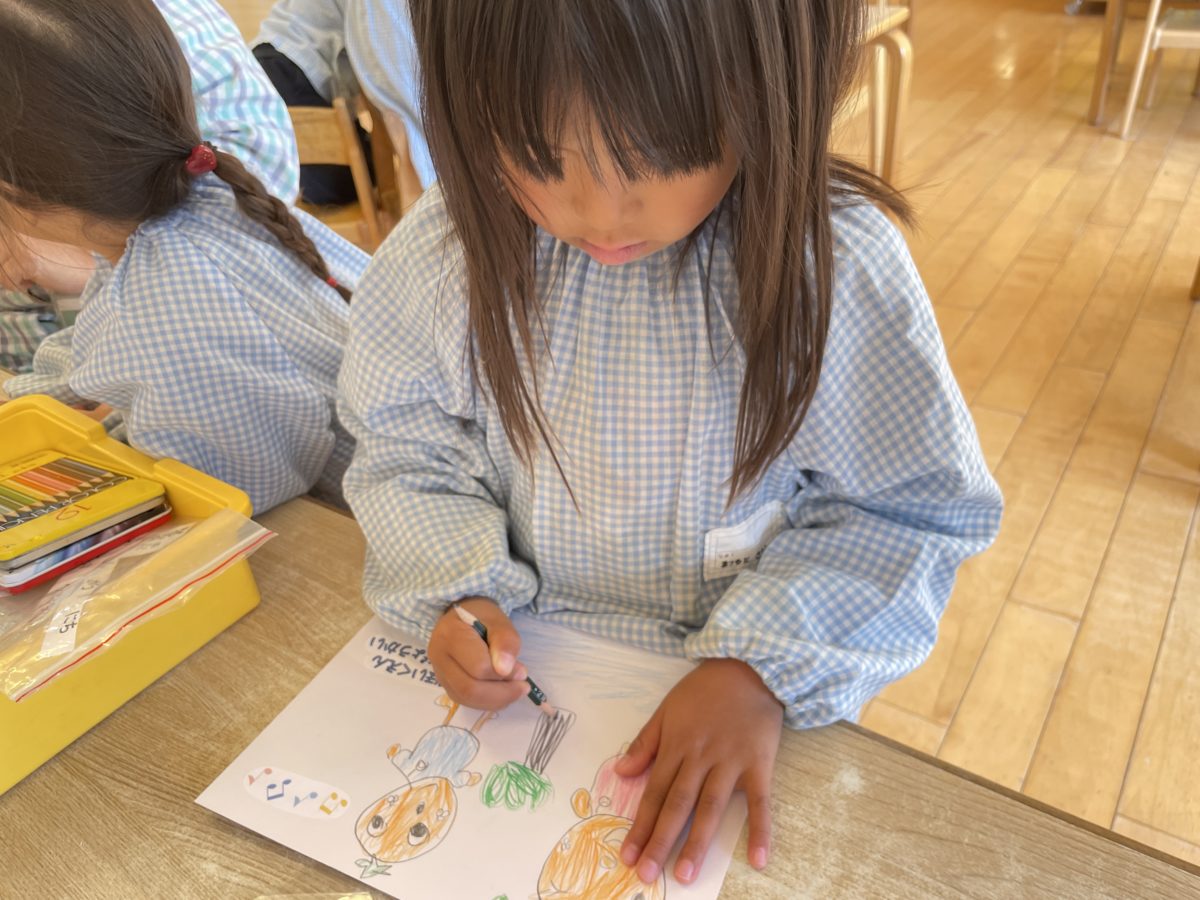 上手に書けるかな?河原田保育園のキャラクター(みかんちゃん)を描いていました。
