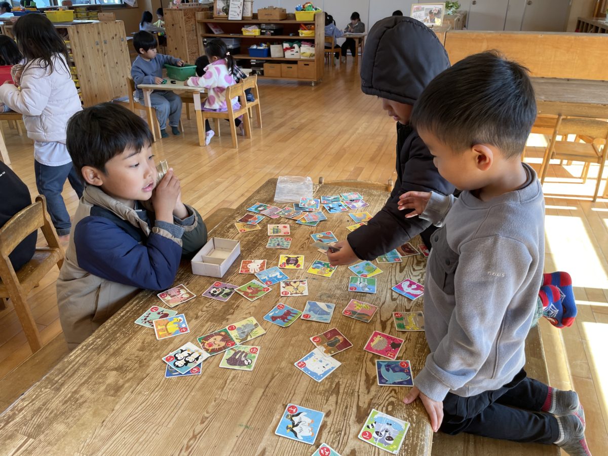 お部屋でかるた遊びをしていためろん組さん読めるひらがなが増えてきたようです。読み札も「【ら】やで!分かる?」とお友だちに書いてあるひらがなを説明しながらかるた遊びを楽しんでいました。