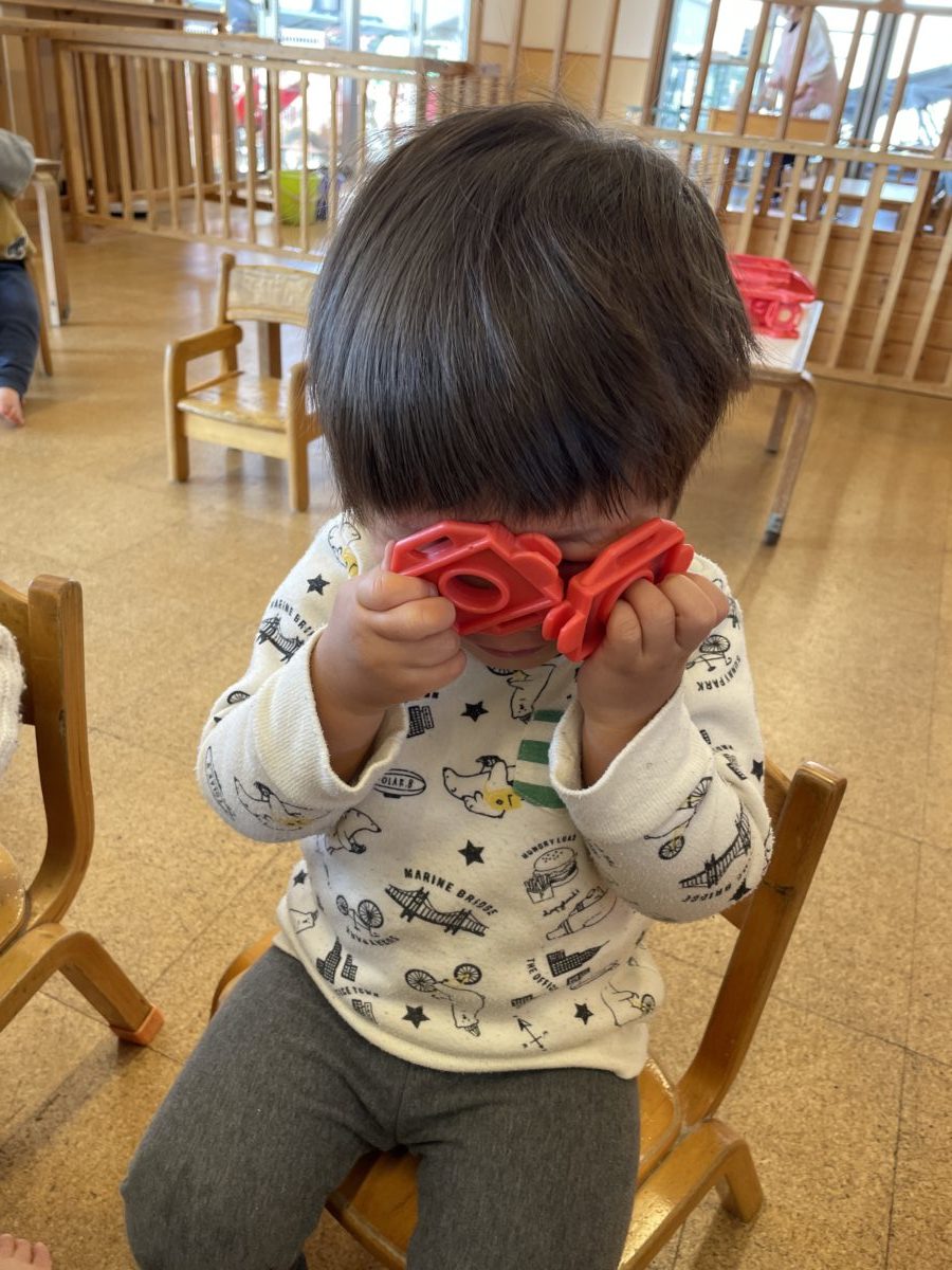 ♪まん丸窓から覗いたら~〇〇ちゃんのお顔が見えました♪と歌うと穴が空いたところから覗く可愛い姿が!
