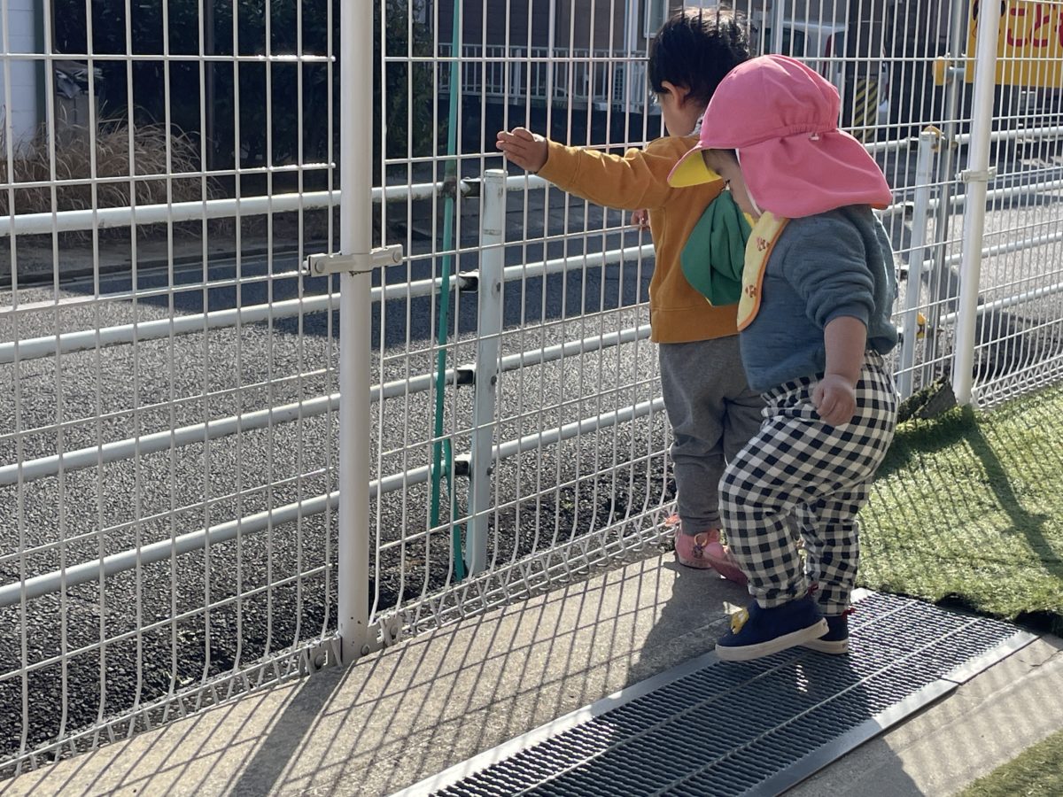 すいか組のお友だちも靴を履いてお散歩。手を繋いで貰って歩いたりして嬉しそう。
