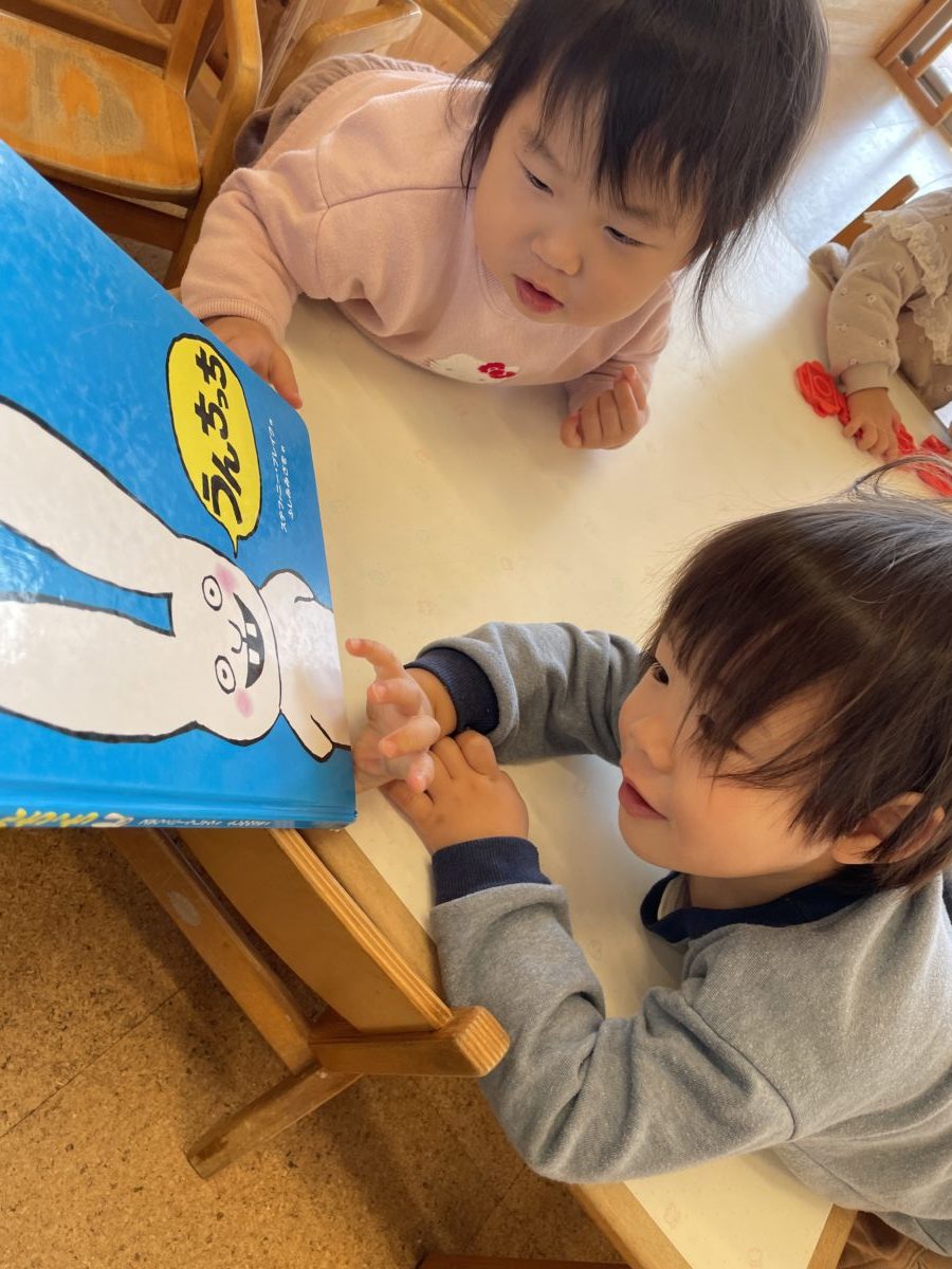 お友だちが集まってきたので絵本を見ました。一つは繰り返しのある絵本で何度も繰り返されるセリフをみんなで呪文のようにつぶやく可愛らしい姿があり、ちょっと面白くて笑っちゃう絵本では、あるセリフが出ると大笑いする姿もありました。お気に入りの絵本を子ども達と一緒に楽しみました。