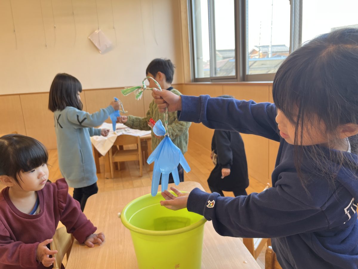 登園してくると、「昨日の手袋どうなったかな?」「なにそれ!」「○○も見たい!」と話す子ども達。「こっちやで!」と案内してくれた先には昨日めろん組さんが「氷になるかな?」と置いて帰った手袋がありました。「みて!氷があるよ!」と周りに氷があるのを発見して「手袋も氷できてるかも!」と胸を高鳴らせながら取ってみると・・・ 「ちょっとできてる!」「ここに氷あるで!」「つめたい!」と氷が出来ていたことに喜ぶ子ども達。「みて!こっちにもある!」「すごー!」「○○も触りたい!触らせて!」と楽しそうに観察をしたり、触れてみる様子がありました。「○○にも見せたい!」「もうちょっと置いとく」「ここに置いてたら無くなるで」とお友だちに見せるために手袋を戻しに行くと、、、「みて!手の形の氷が出来てる!」と、手袋の置いてあった場所に手の形の氷が出来ていました。「すご!」「氷やで!」「○○ちゃん!こっちも氷やで!」と氷探しが始まりました。その後、みんなで手袋を見に行くと、「あれ?」「氷ない」・・・まさかの氷が解けてしまい、「とけたんちゃう」と少し悲しそうな表情を浮かべていましたが、次第に「プルプルするで!」「みてみて!水が出てきた!」と今度は手袋を使って遊び始める子どもたちでした。