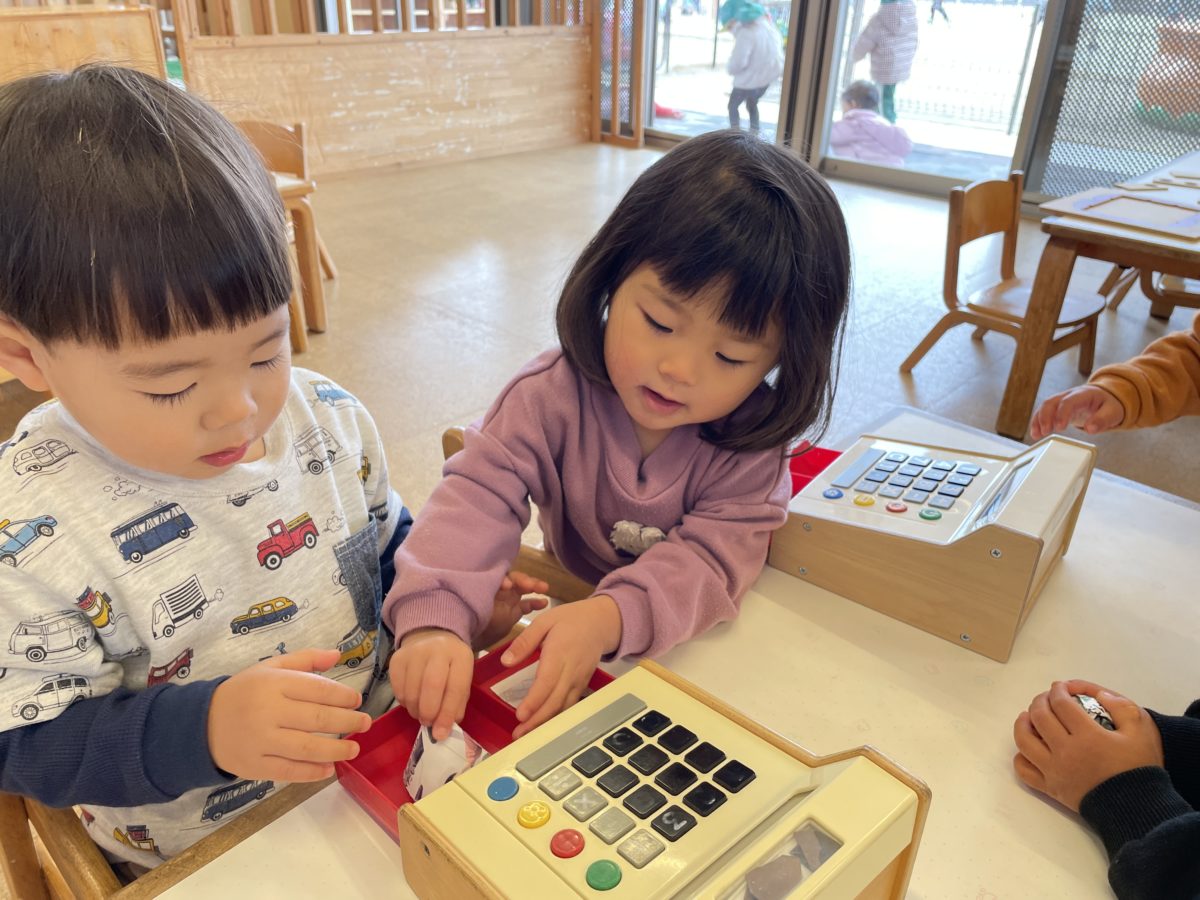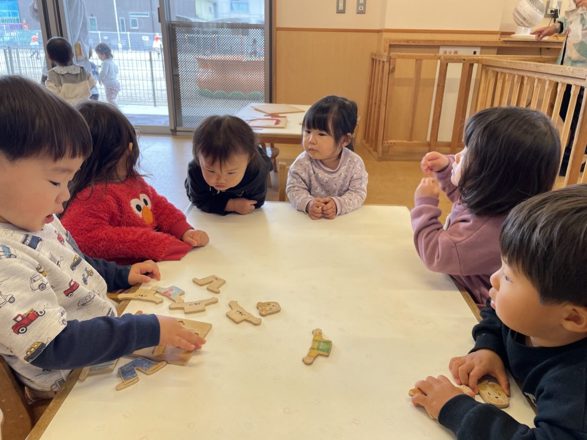 午前のおやつを食べ終え、子どもたちが見つけたおもちゃは着せ替えパズル!お洋服を着せ替え出来るパズルが置いてあるのを見つけると、「これやる!」と子ども達が集まってきました。パズルの土台は1つしかなく「○○が先やるの!」「いや!」と取り合いが始まってしまいましたが、それを見たお友だちの「順番こしよ!」「先○○くんから!」という声もあり順番で回していく事になりました。最初は夢中になり長い時間あそんでしまったり、早く遊びたくてお友だちの順番より先に取ってしまうこともあり、なかなか順番通り・・・とはいきませんでしたが、お友だちが1回ずつ交代しているのを見たり、「次○○くんやで!」「かわって!」と聞いてどんどん交代がスムーズになっていきました。自分の番が来るまで「まだかな?まだかな?」とワクワクで待つ姿があったり、自分の番が終わると次の子に「どうぞ!」と渡して次の番が回ってくるまで「まだかな?」と待つ姿がとても微笑ましかったです。