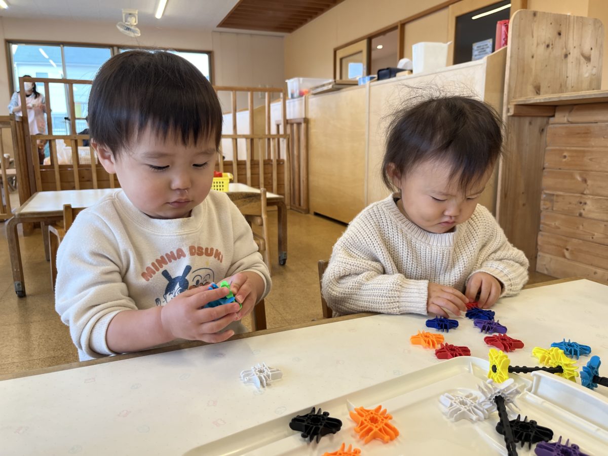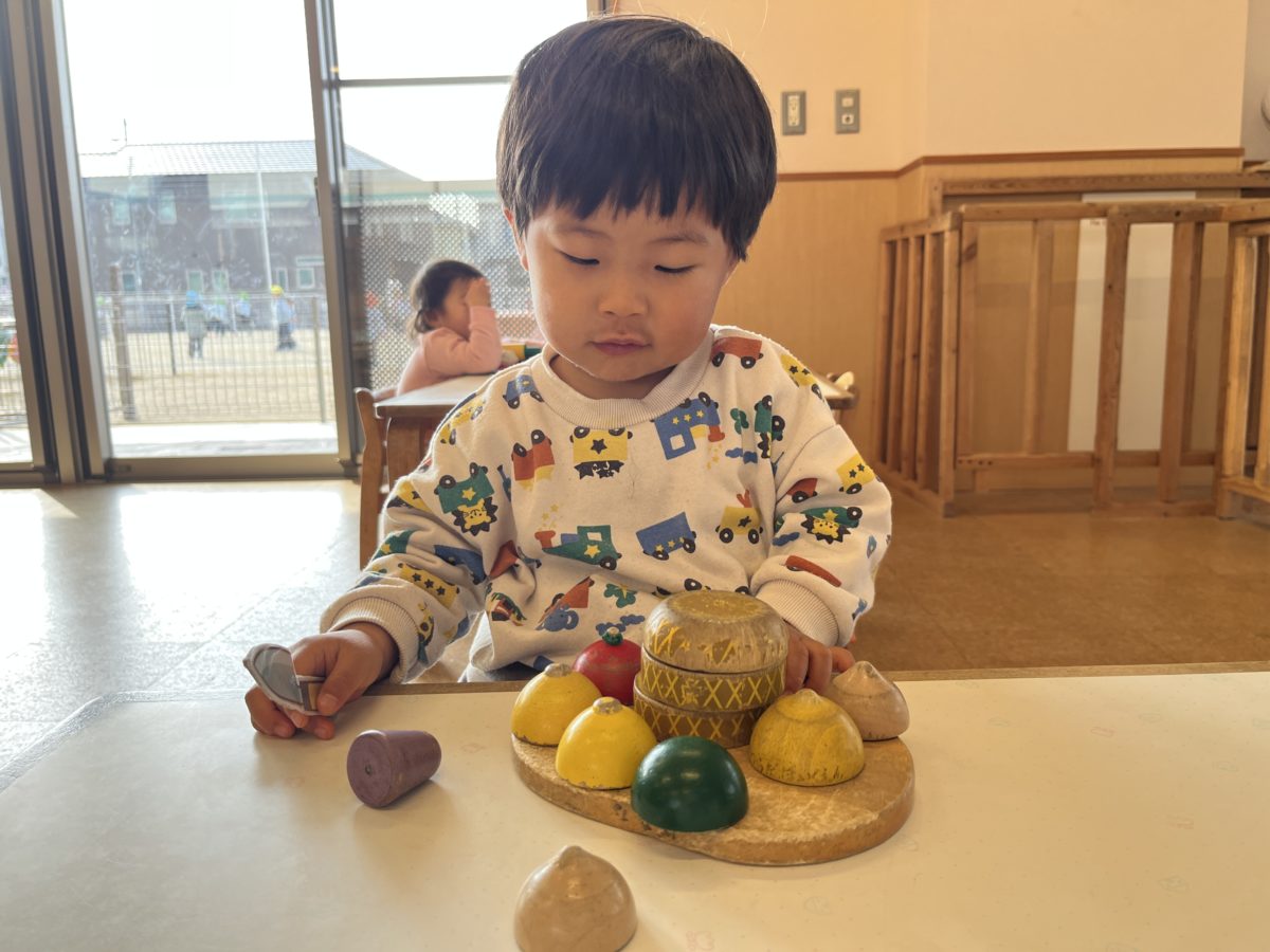 絵本を見終えた後は、ブロックや粘土など好きなおもちゃを手に取り遊び始めていました。中でも人気なのが木製で出来た果物のおもちゃ。まな板におもちゃの包丁を片手に、トントン!と言う音がお部屋に響きます。「これママやってるの」「ほうちょうだよ」とお家でもお母さんやお父さんの姿をよく見ているようで「こうするの」と色々な話が聞こえてきました。「これトマト!レモンもあるよ」「これナス?」と野菜や果物にも興味津々。順番に包丁で切っていく姿はまるで小さなコックさんのようでしたよ。まな板いっぱいに果物や野菜を盛り付けると・・・「できた!」と料理の完成。「これ、かぼちゃとレモンのーー○○○・・・」と料理の名前のように呟いていました。