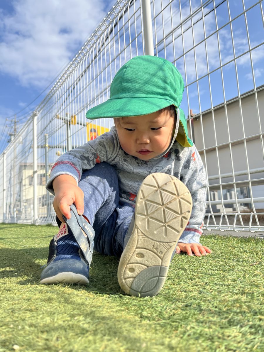 脱げてしまった靴を一生懸命自分で履こうとしています。