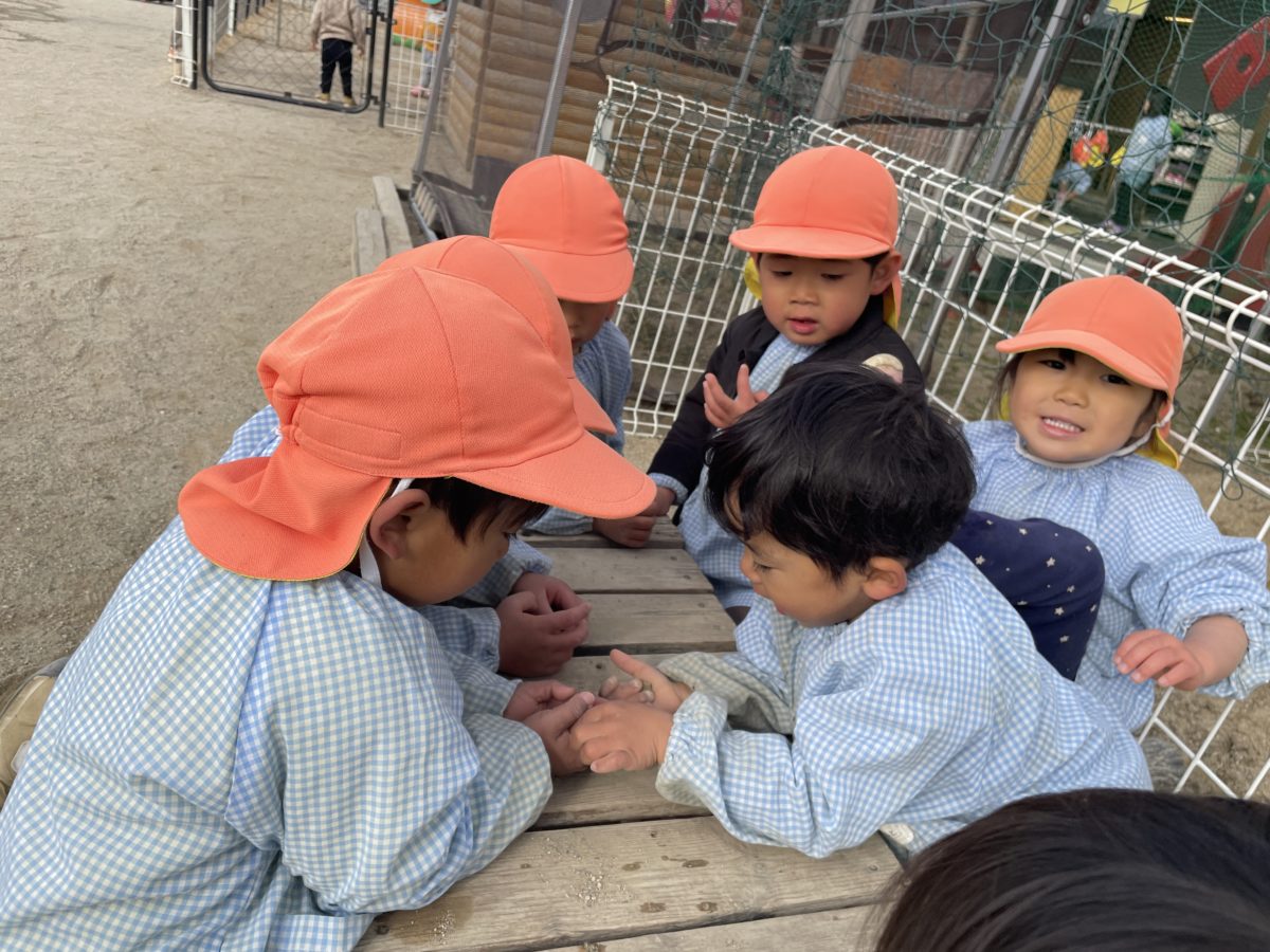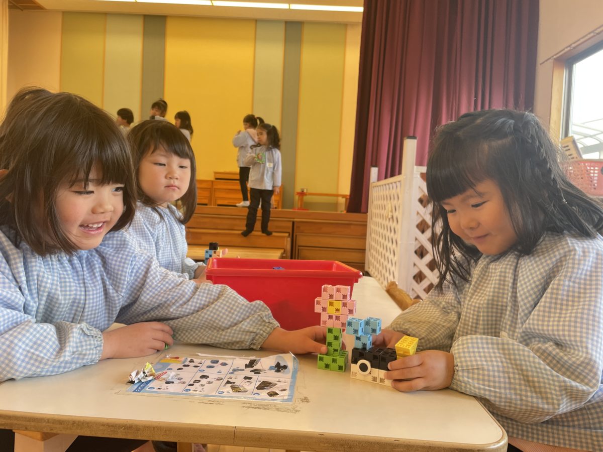 園庭でボール遊びをしていた子どもたち。今日はめろん組さんがドッチボールをしていた様子を見ていたこともあり「やりたいな!」とドッヂボールに挑戦!!ルールもやっている姿を見てきていたためか何となくみんなが理解をしている様子もあり、数人のお友だちで楽しむ姿がありました。そして、その後にはボールをどれだけ高くあげられるかの対決が始まりました。「どうやってしたらたかくあがるんやろうな。」「したからいきおいよくなげたらいいんかな?」と色んな投げ方を試していました。そして、やっていくうちに「いきおいよくしたからなげたらたかくなったー!」「めっちゃたかくなったなぁ。おそらまでとんでいったらおもしろいのにな!」と空を目指す子どもたち。そして、保育園横の道路に大きな工事車両が…。「なんかおおきいのきたー!」とりんご組のお友だちが走って行くとそれを見て他の子たちも「なになに?あれは、ロードローラーやで。」とりんご組さんに何の車両かを教えてあげる姿があり、「ばいばーい」と手を振ってお見送りする様子などもありました。室内では、ブロックでくじらを作っていたお友だちの様子を見て「わたしもなんかつくろっかな~」とお友だちの姿を見て作り始める様子があり、「わたしもできたー!おはなだよ!!」とお友だちが作っている姿を見て何かを作りたくなったようでした。完成したものを2つ並べて、「かわいいのできたね~」と嬉しそうに話す声も聞こえてきました。