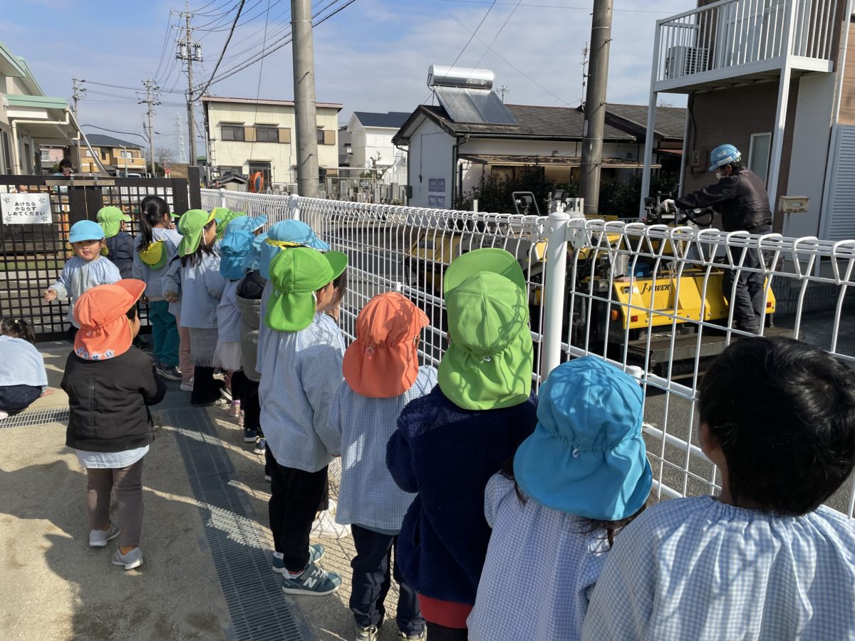 「なんかきたー!!」「あれはロードローラーや!!」と保育園の横を通っていく工事車両に興味津々!!