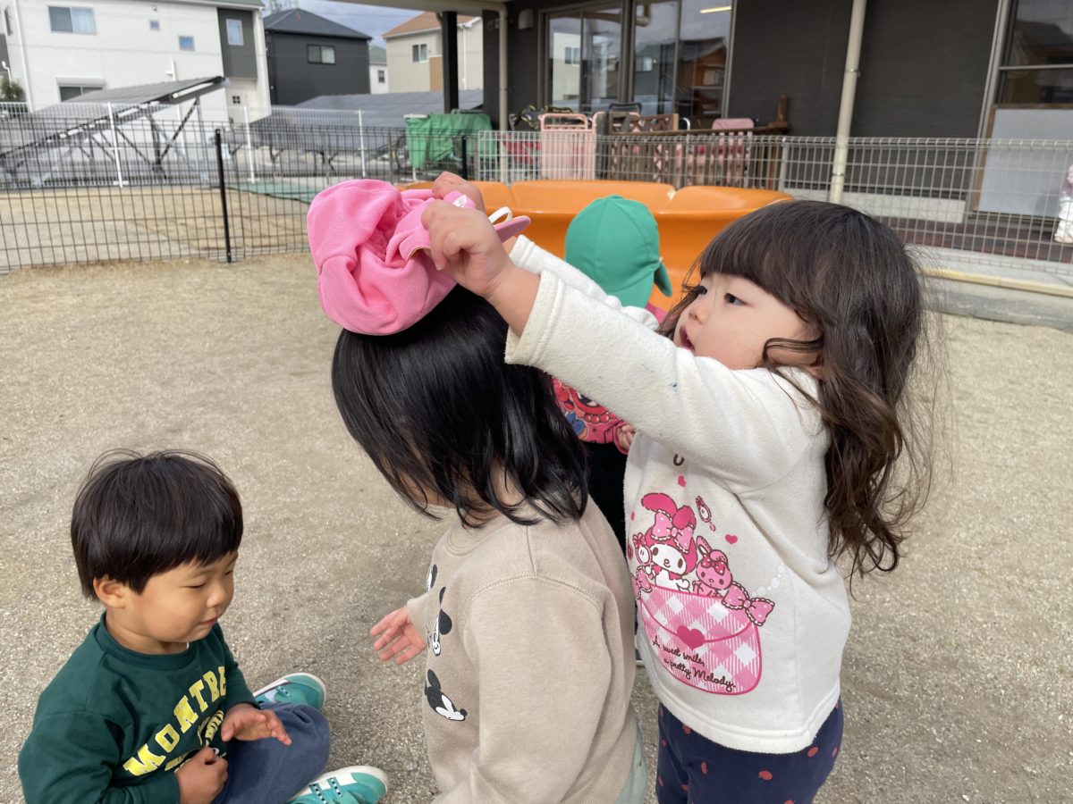 お友達の帽子が落ちているのを見つけると、被せてあげる姿がありました。