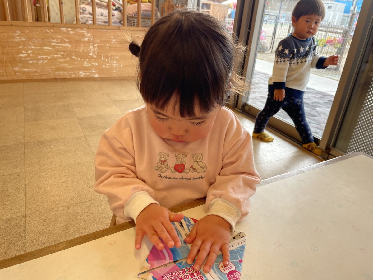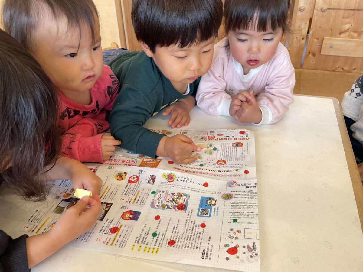 折り紙にペンで丸を描いていると、「なにそれ!」「あかがいい!」と近寄ってくる子ども達。丸を描いた4枚の折り紙を繋げると・・・「おっきい!」「これなにすんの!」「すごー!」と大きくなった折り紙に興味津々の様子。すると、「シール貼る!」「ここに貼る!」と赤い丸にシールを貼りたいと言う子どもの声があったので、横にシールを置いてみると、「○○ちゃんはここね!」「ここ貼れる!」とお友達と話しながらシールを貼る姿がありました。しばらくすると、「どうぞ!」「はい!」と、少なくなってきたシールを分け合う姿や、すいか組さんがいるのに気付いたいちご組さんが、台紙から剥がして渡してあげる優しい姿もありました。
