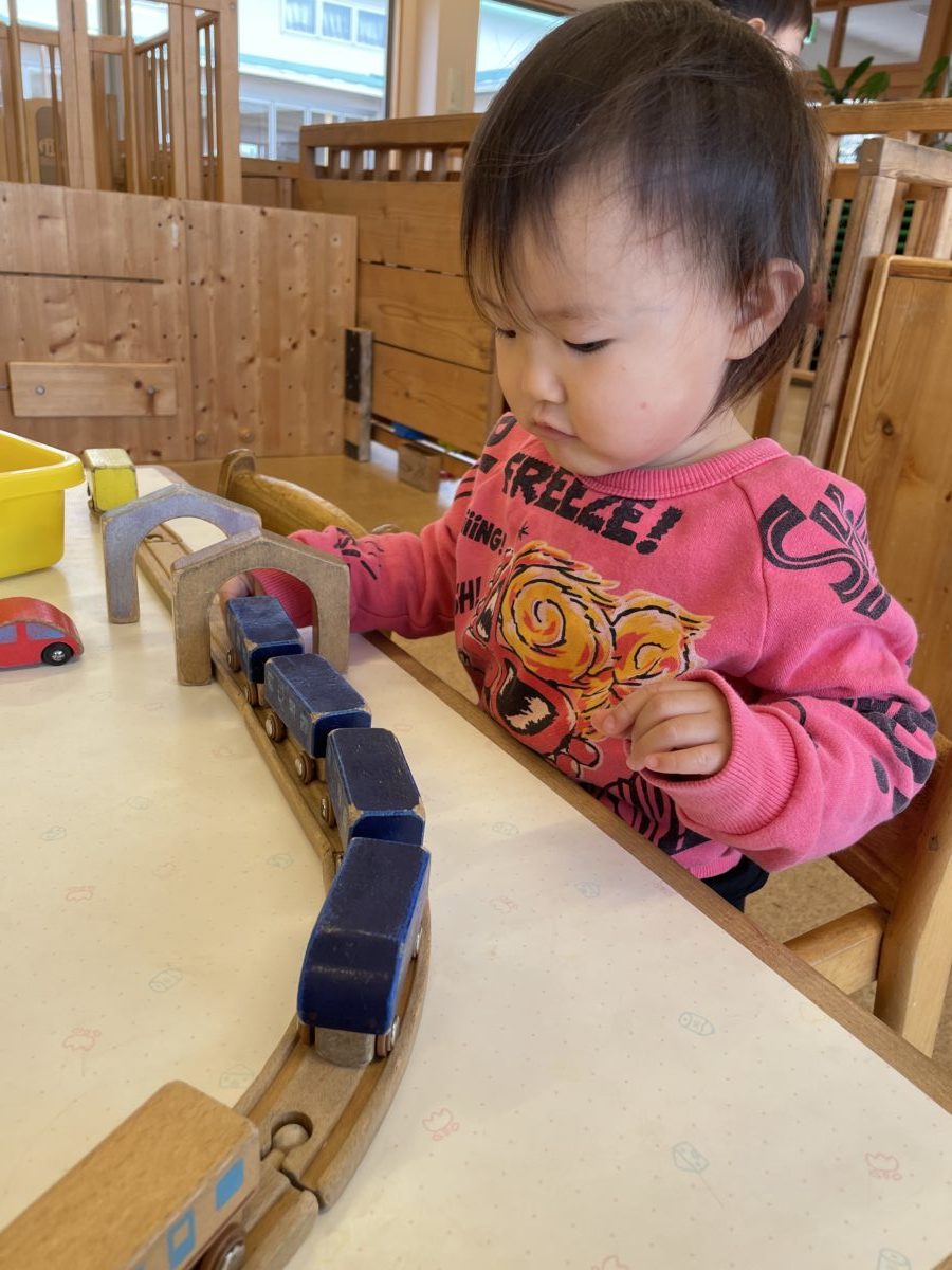一方で、戸外では芝生のある園庭へ遊びに行くと、1番に駆け寄っていくのは「グルグル回るフラワーカップ」。「今日は濡れてない!」「やったー!」と嬉しそうに座わり、フラワーカップはグルグル回り出しました。「きゃー!」「わー!」と楽しそうな子どもたちの声に、大きい組のお姉さんたちも「なになに?」と興味津々でした。「バス歌う!」「これやろ!」とお友だちの提案で、「バスにのって」を歌うことになり、「出発進行!」の掛け声とともに「バスに乗って揺られてる!ごー!ごー!」と歌いだし、右や左へ倒れたり、でこぼこ道では足をバタバタさせて遊ぶ姿がありました。