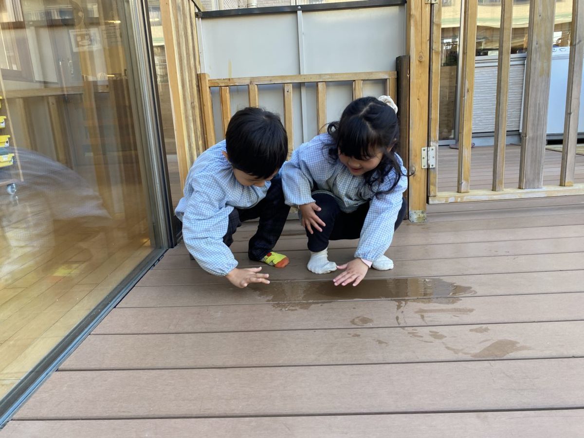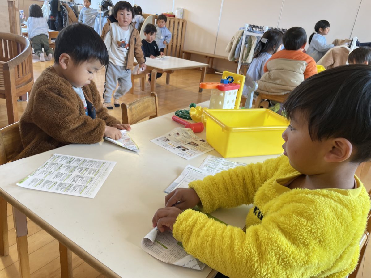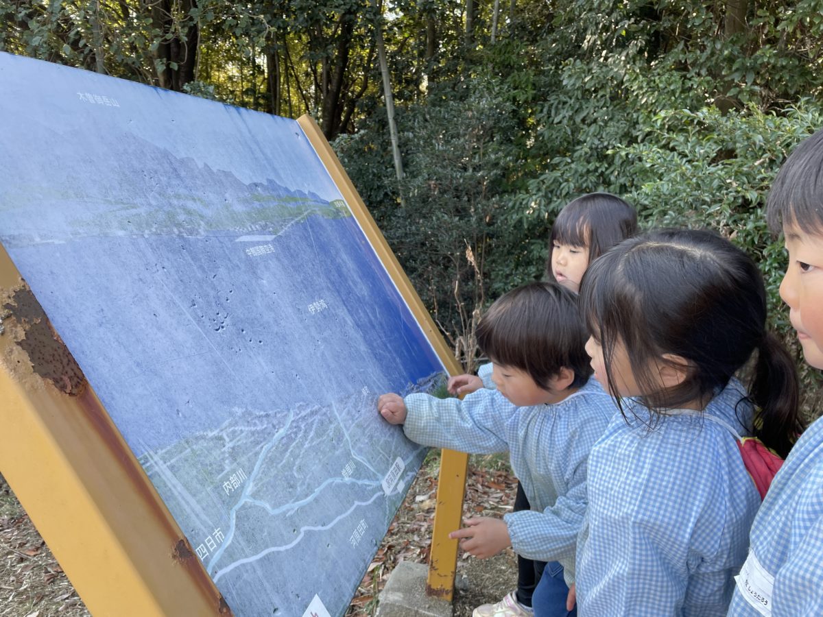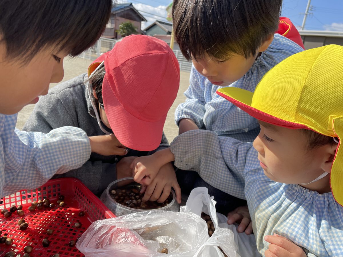 今日は河原田神社へ参拝へ出かけました。保育園から出ると「こっちがわ(車が横を通る方)におおきいこがくるんやで!」と前の子に声をかけて教えてあげていたり、道を渡る時には「みぎよし、ひだりよし、みぎよし!!」と左右を自分の目で車が来ていないか確認をするめろん組さん。その姿を見てばなな・さくらんぼ組さんも「みぎよし、ひだりよし、みぎよし!」と大きい子の真似をして道を横断する際には確認する姿がありました。神社へ着くと、「おまいりするやろ?ぼくおおみそかのときにもまっくらのときにここきたんやで~!」とお友だちと話す様子があったり「おまいりのしかたおぼえてるよ。」と横にいる子にお詣りのやり方を教える子どもたちの姿もありました。そしてその後、神社の上へあがっていくと「なにこれ~?」と子どもたちが地図に興味を示していました。「かんじばっかりでなんてかいてあるかわからへんけど・・・」という声も聞こえてきました。すると「もしかして、これがあれかな?」と目の前の地図と景色を見比べながら地図上の建物などを探していました。そして神社からの帰路へ着こうとしたとき「みてー。どんぐりめっちゃおちてる!!」とどんぐり探しが始まりました。「すっごいたくさんあるよ~」と探していくうちにたくさんのどんぐりが見つかり気が付いたころには子どもたちの手のひらいっぱいになるほどのどんぐりが見つかりました。そして園に戻ってからどんぐりの選別を始め「みずのなかにいれてういたやつはむしがたべたやつってきいたことある。」とめろん組さんが1つ1つ丁寧に使えるものと使えないものを仕分けていると「なんでこれはひびはいっててもういてきてないのに、こっちはういてるんやろ?」と不思議さを感じている子どもたちの姿がありました。