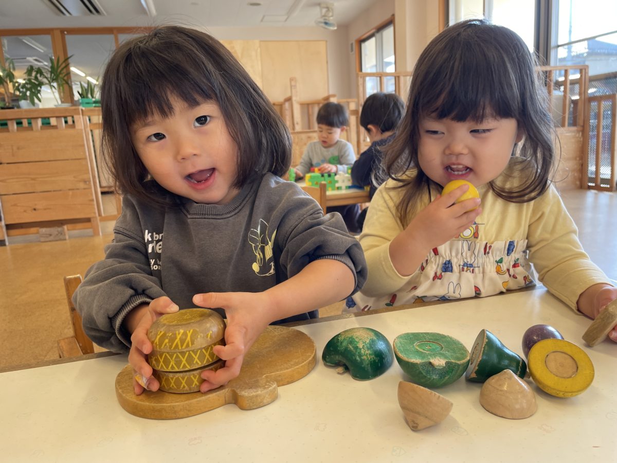 まな板の上に具材を乗せて、三つに重ねると、「ハンバーガー!」と嬉しそう!