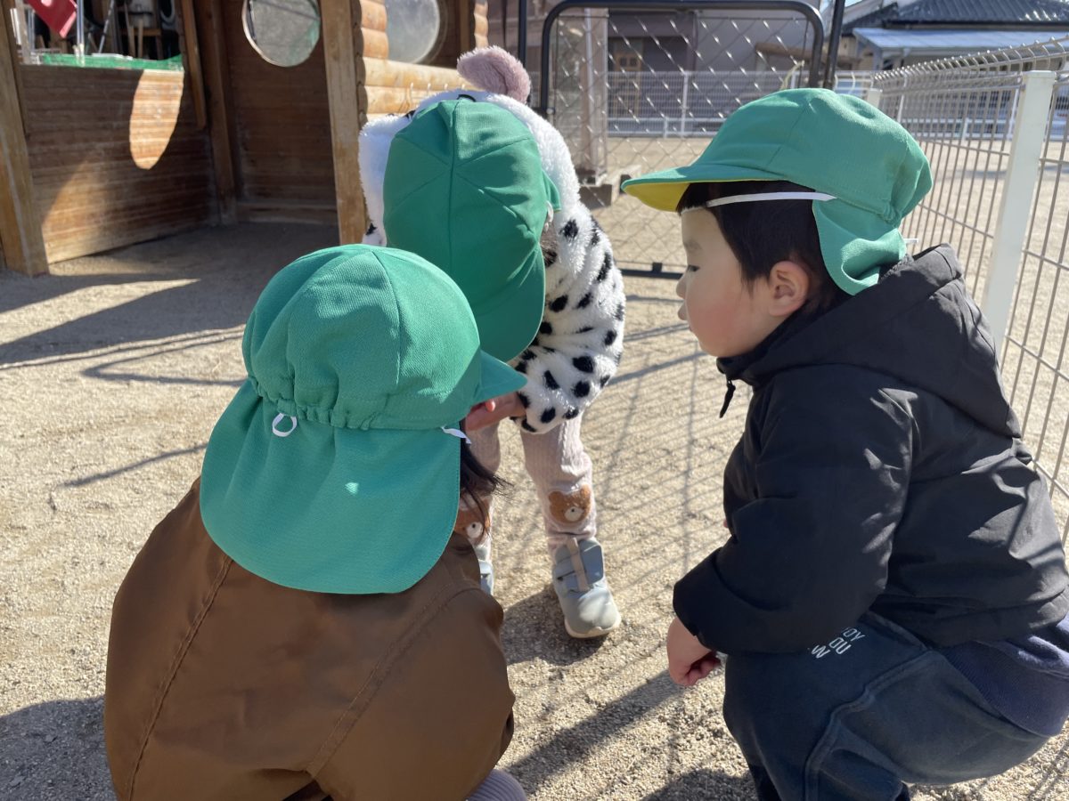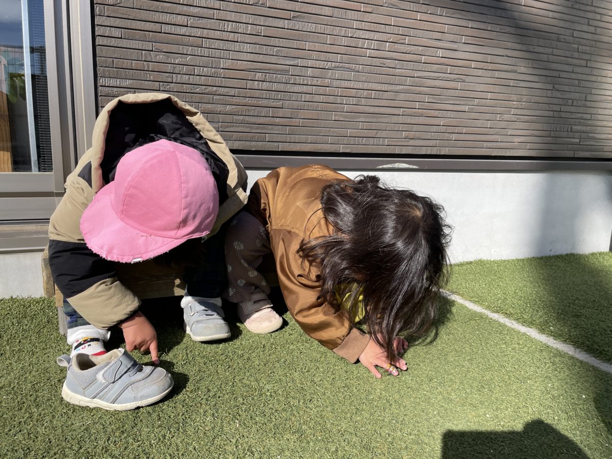 今日は園庭にてんとう虫の可愛いお客さんが遊びに来ました。てんとう虫を見つけて手のひらに載せると、嬉しそうに手のひらを見せ、それに気付いたお友だちが「てんとうむしー!ほしい!」と言いながら園庭を下を向いて歩きだしたので、他の所にもいないか大きい園庭や道路側の通路にも探しにいってみました。座りながら「てんとう虫いるかな?」「○○ダンゴムシがほしいな。」と楽しそう探す姿があり、とても楽しそうにしてました。結局てんとう虫は見つからなっかったのですが、子ども達は「いなかったね~。」と満足そうでした。